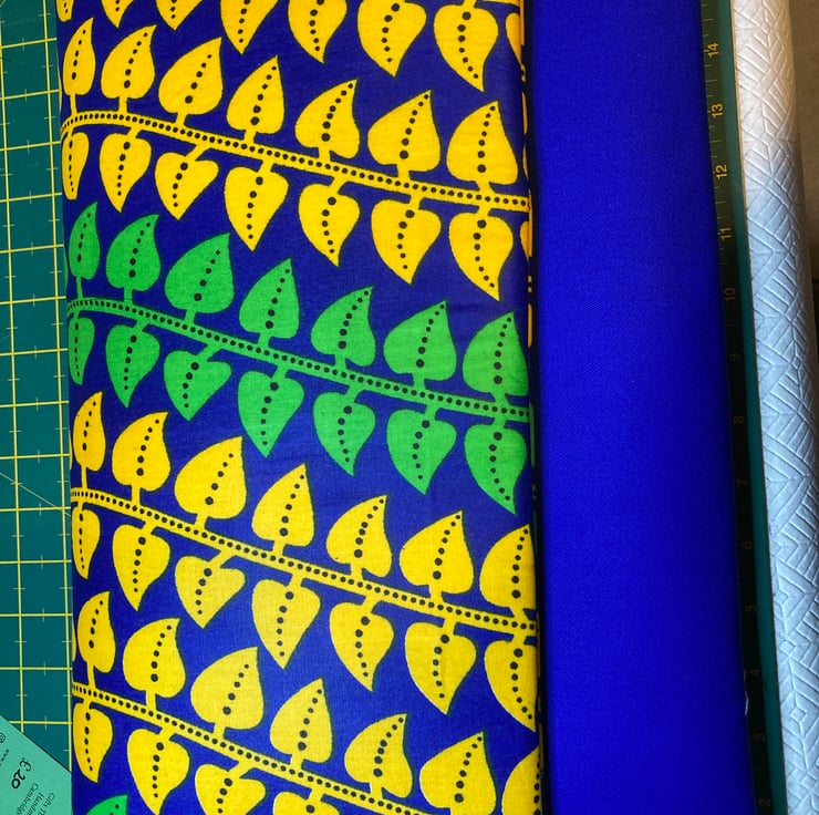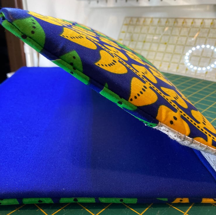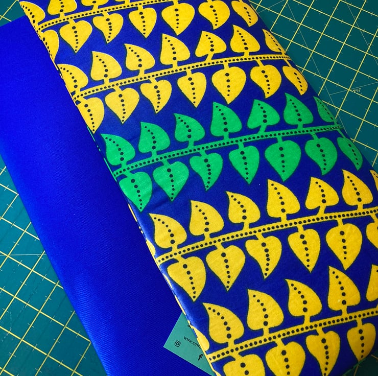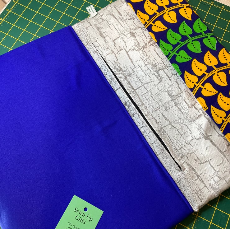 The outside of the case is made from a vibrant cotton wax print which comes from the Ivory Coast and the contrast blue is a strong cotton drill. The inside of the folder has a silver grey lining from hardwearing upholstery fabric.