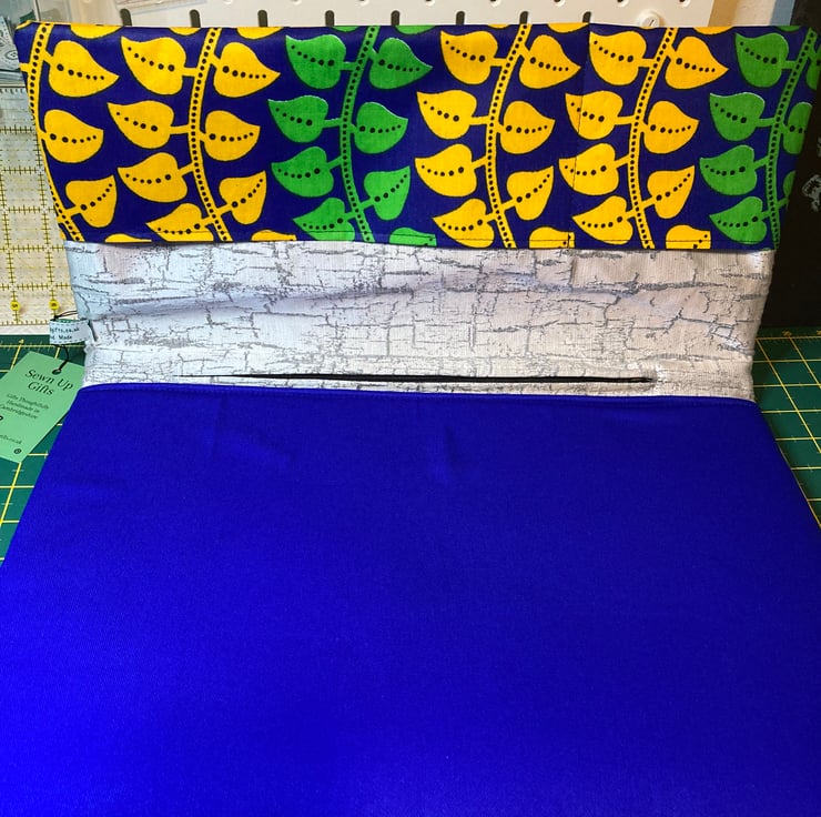 A vibrant and strongly padded case to stash a laptop and other work items. Fully stabilised with fusibles and an extra stiffener inserted by a zip inside. There are two slots on the inside of the flap for cards and notes etc