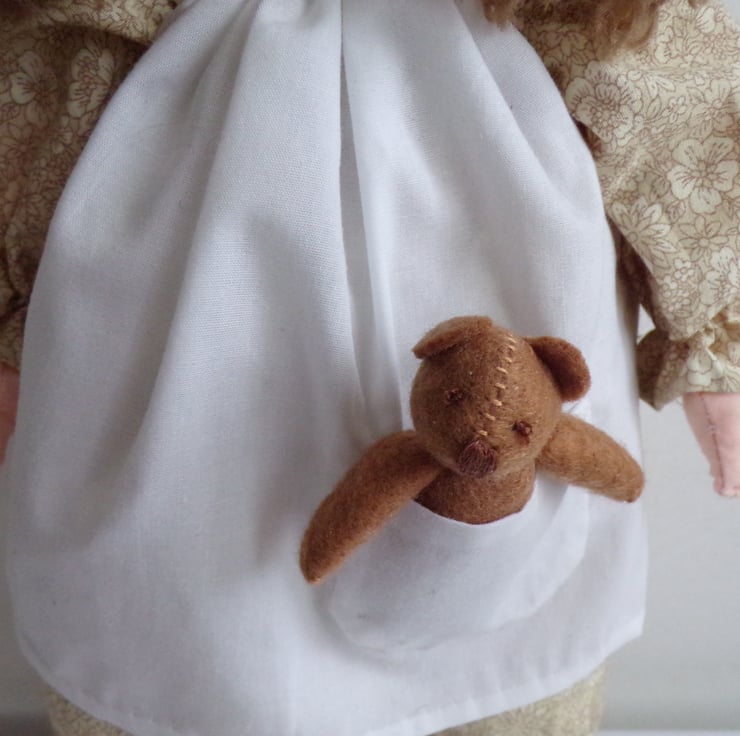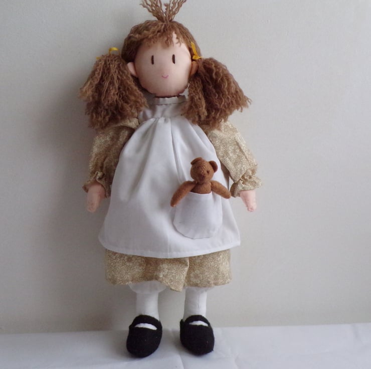 Ella is a beautiful 14 inch rag doll, perfect size for little arms to cuddle. She comes to you in a removable dress and apron, with fixed bloomers on under the dress, little black shoes and yellow ribbons in her hair. She carries a little teddy bear in her pocket made from felt. Ella is filled with polyester filling. A handstitched doll, made with love. Ella would make a lovely forever friend for the little (or big) person in your life.