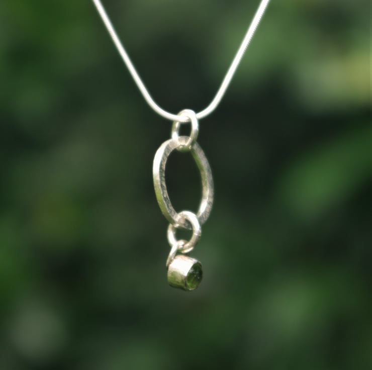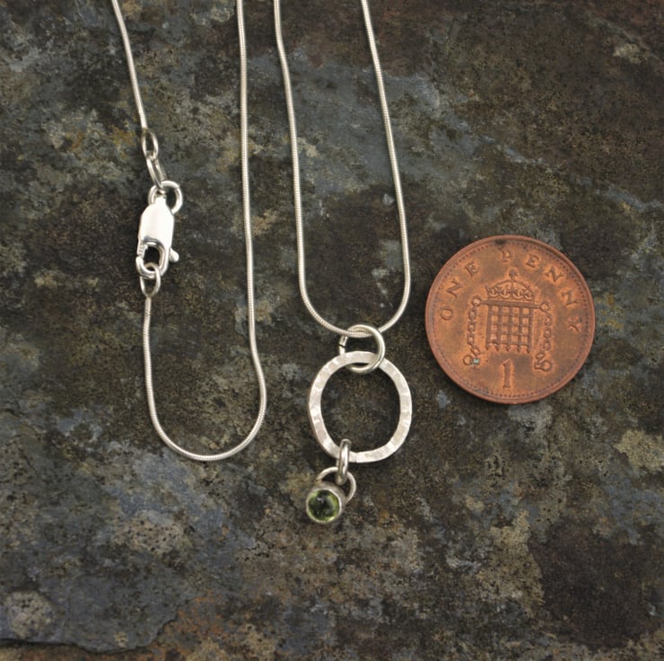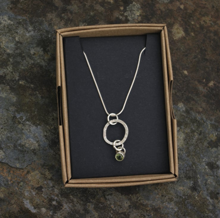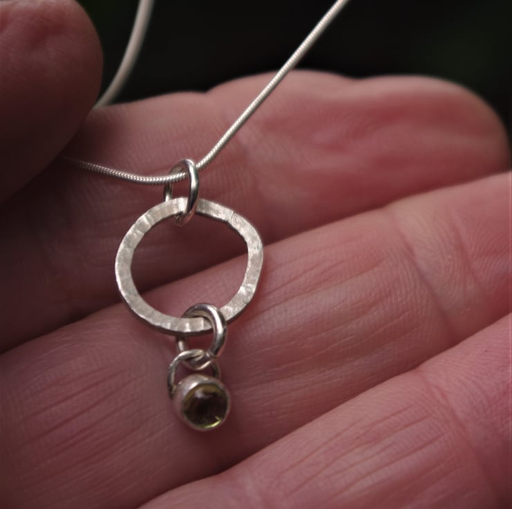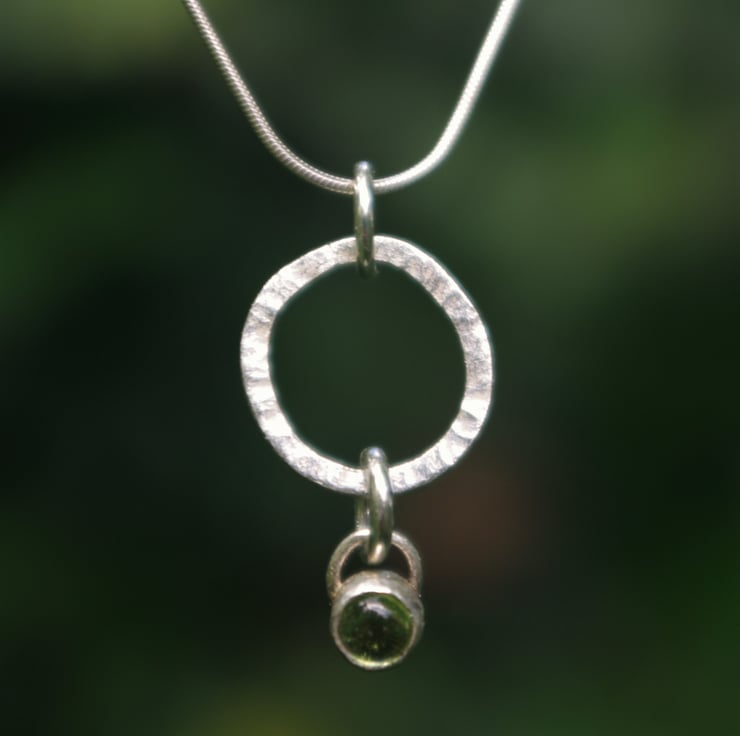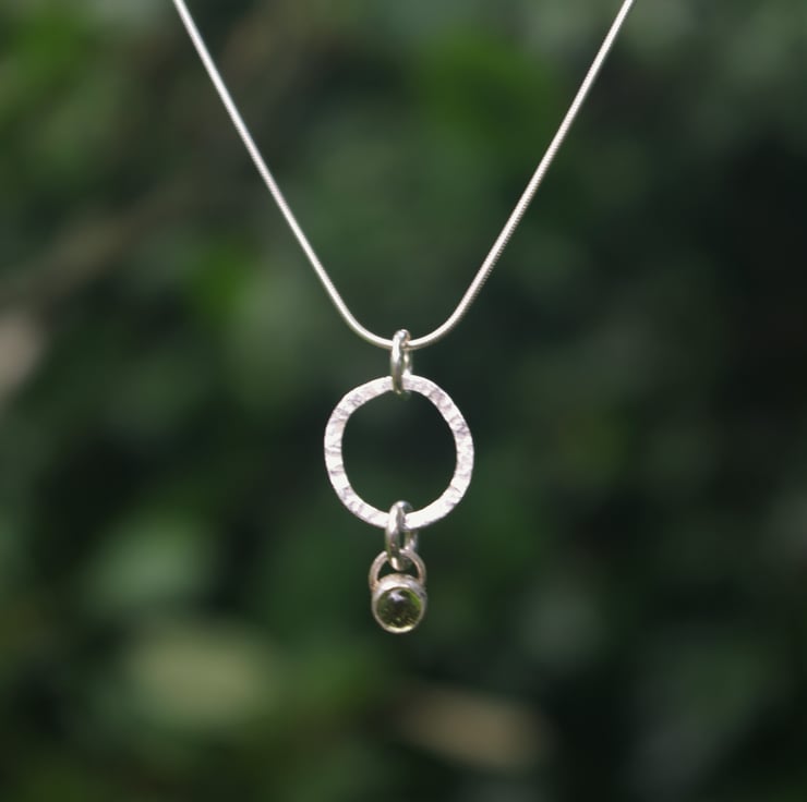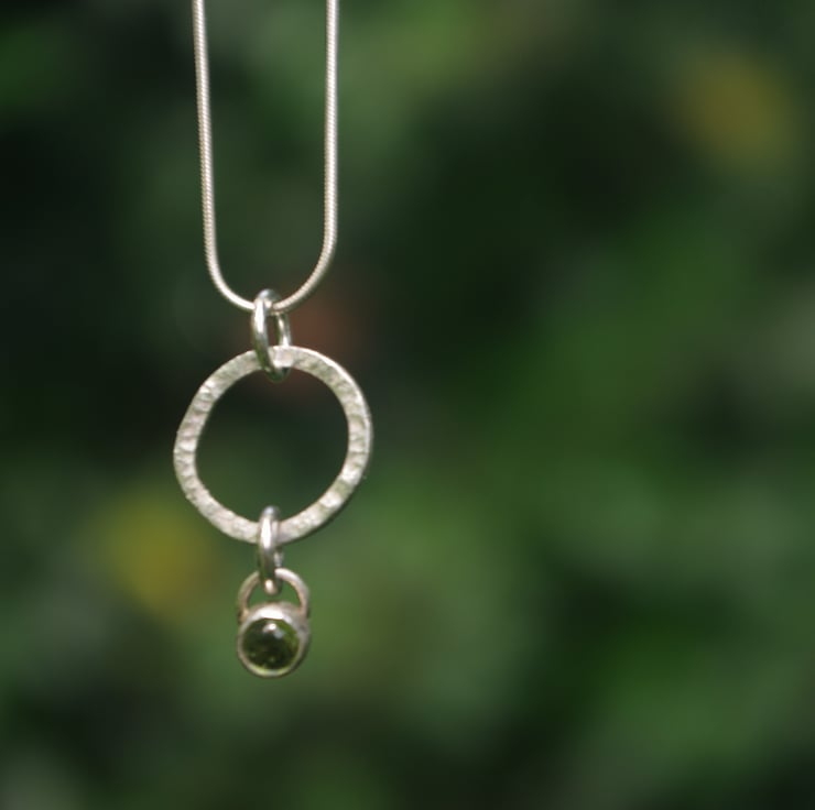 Sterling silver circular pendant inspired by natural textures; made with square wire and textured with a small hammer. From this dangles a fresh green Peridot cabochon with a diameter of 4mm. This is hand set in silver and dangles from the bottom, moving about freely.