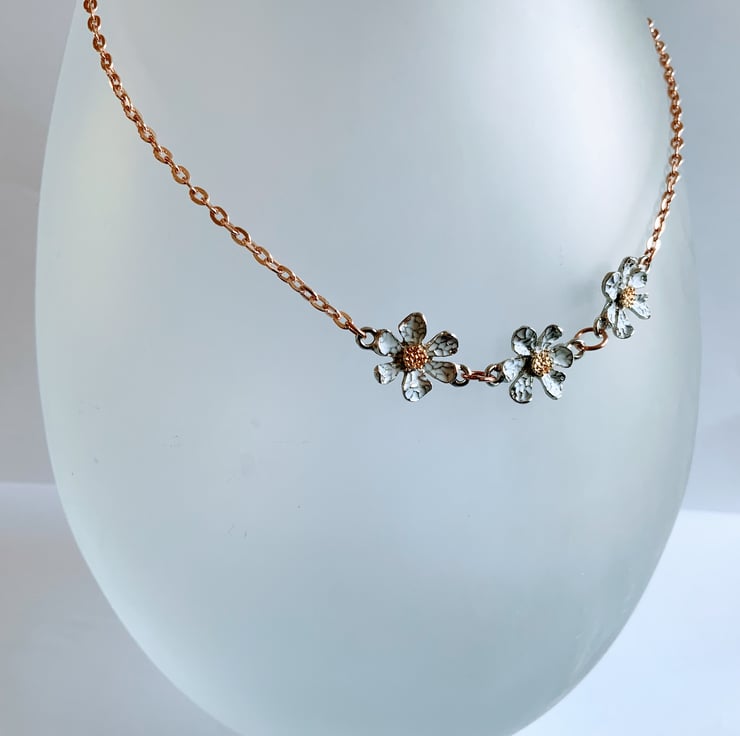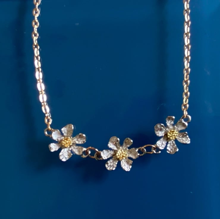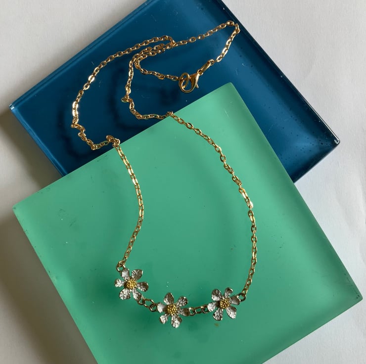 Three enamel daisies ingraved in white and silver grey with gold centre on an 18 inch gold plated chain. Lead and nickel free and rust resistant with a beautiful sparkle.