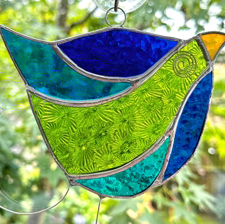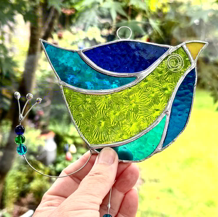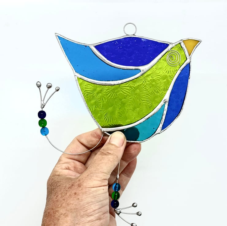 Each piece of glass has been cut by hand, ground, washed, foiled and soldered together then washed again. The eye, legs and feet have been made from tinned wire and glass bead threaded on.