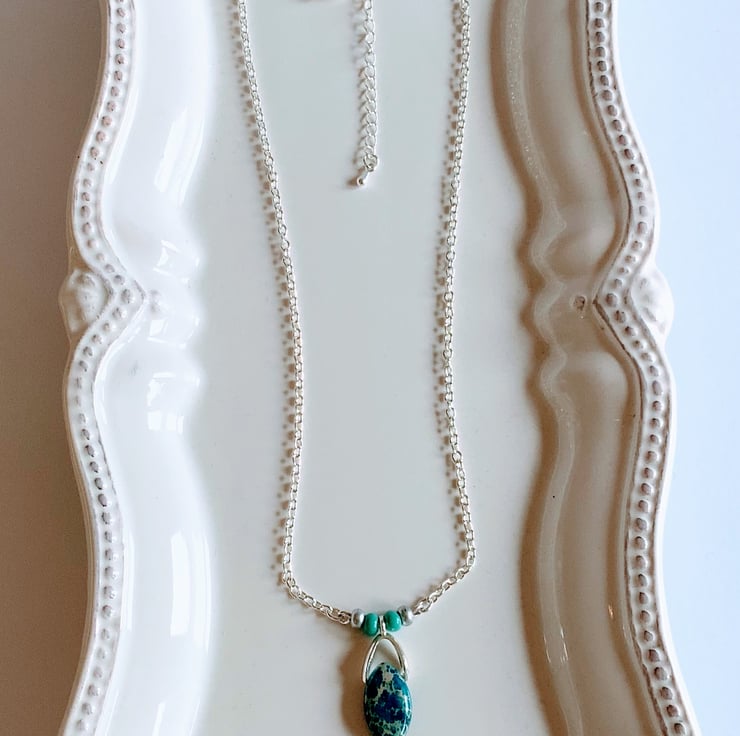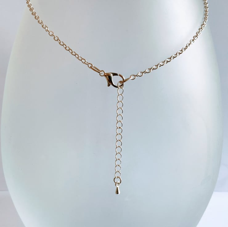 On an 18inch Silver plated cable chain. Lead and nickle free and rust resistant with a beautiful sparkle. There is an added chain extension so you can ajust the lengh if desired.