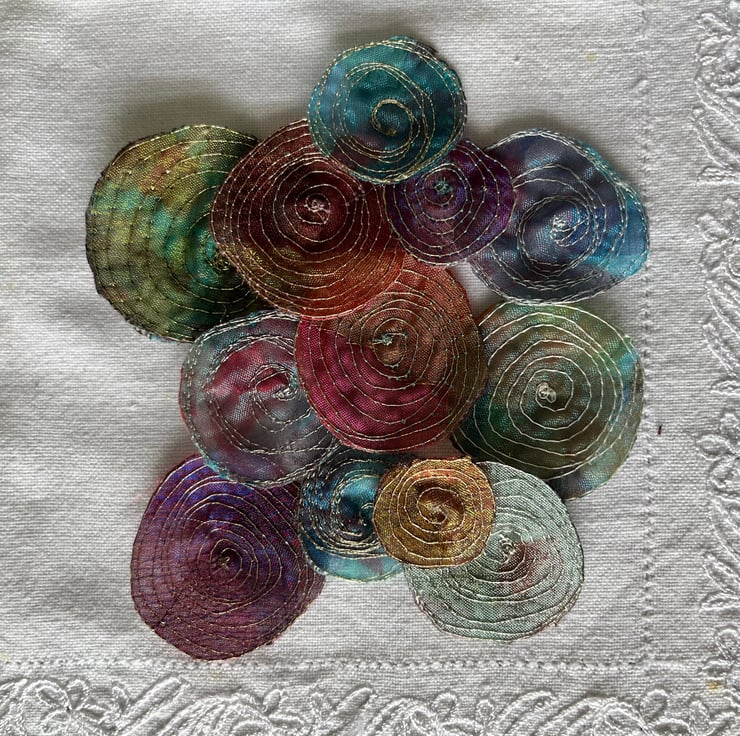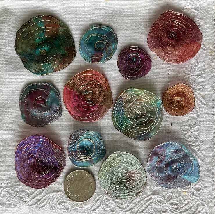 This pack of 12 embellishments have been made by using free motion embroidery techniques - drawing with the sewing machine. Each one is slightly different from another, giving them a quirky and organic look.
