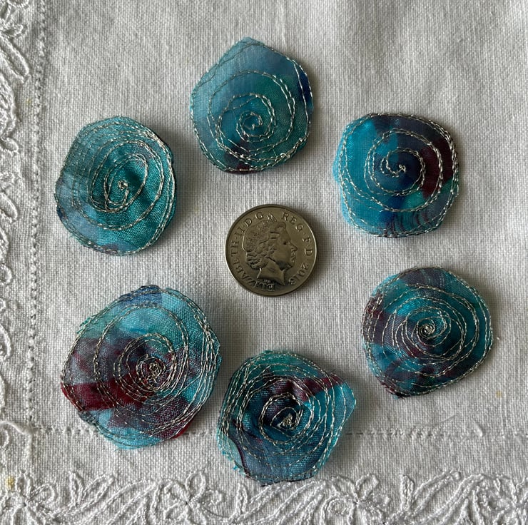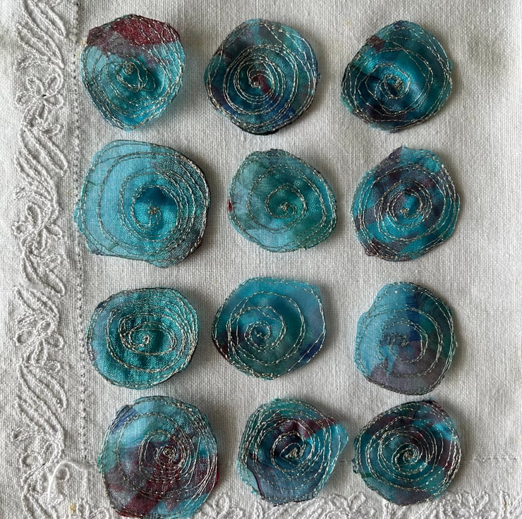 This pack of 12 embellishments have been made by using free motion embroidery techniques - drawing with the sewing machine. Each one is slightly different from another, giving them a quirky and organic look.