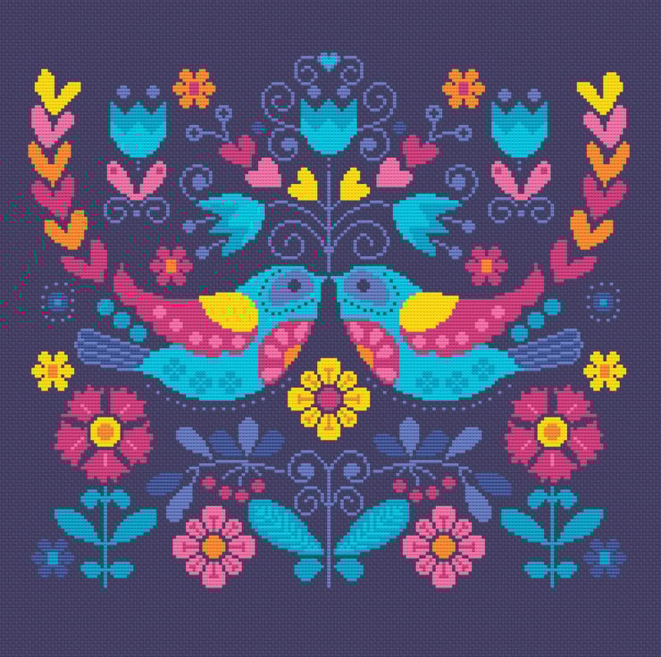 Cross Stitch Pattern Vibrant Colour Mexican Folk Art flower Cinco De Mayo Papel Picado style love birds. Instant PDF chart by Vivsters - 090