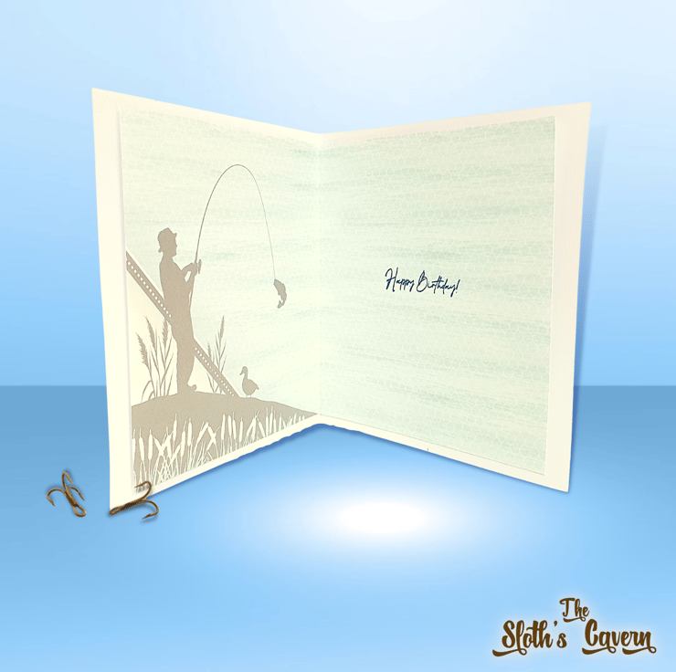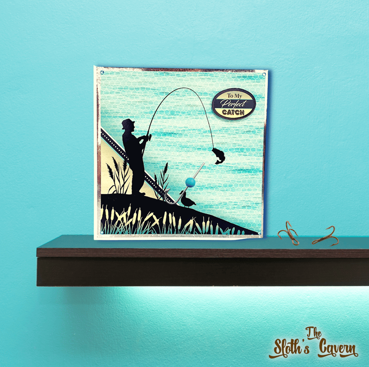 It consists of a white card base, layered with 220gsm ombre mirror card in silver and 350gsm Adorable Scorable cardstock, printed with a fishing scene.