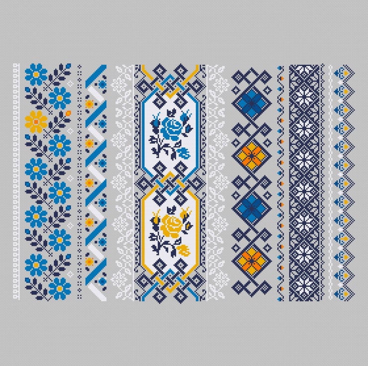 Cross Stitch Banded Floral Border Sampler, Blue Yellow Ukranian Embroidery Modern Folk Art design by Vivsters - PDF counted chart 103B