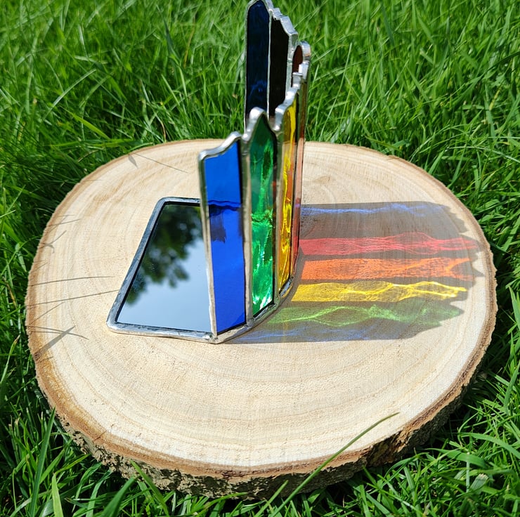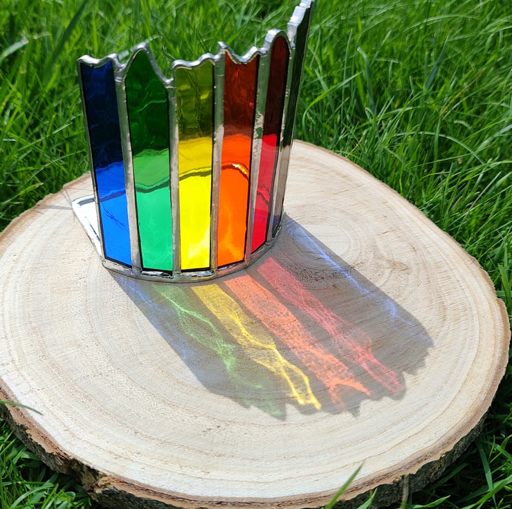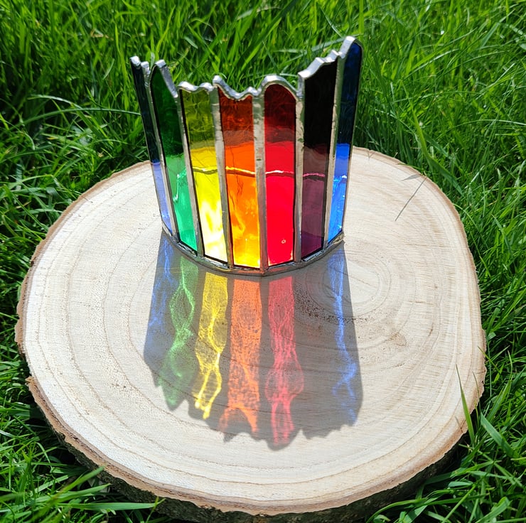 I have made this Stained glass Candle holder/Suncatcher in the colours of the chakra spectrum starting in blue and returning to blue like the circle of life. I has been made in the Tiffany copper foils method from beautiful water glass that really plays with the light as it passes through. This will look equally at home on a mantlepiece above a fire as on a sunny windowseal.