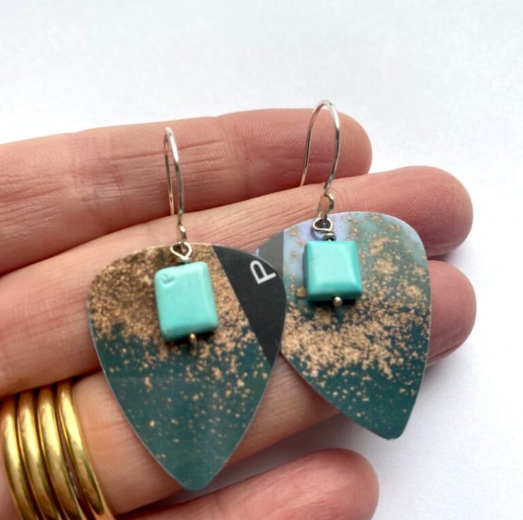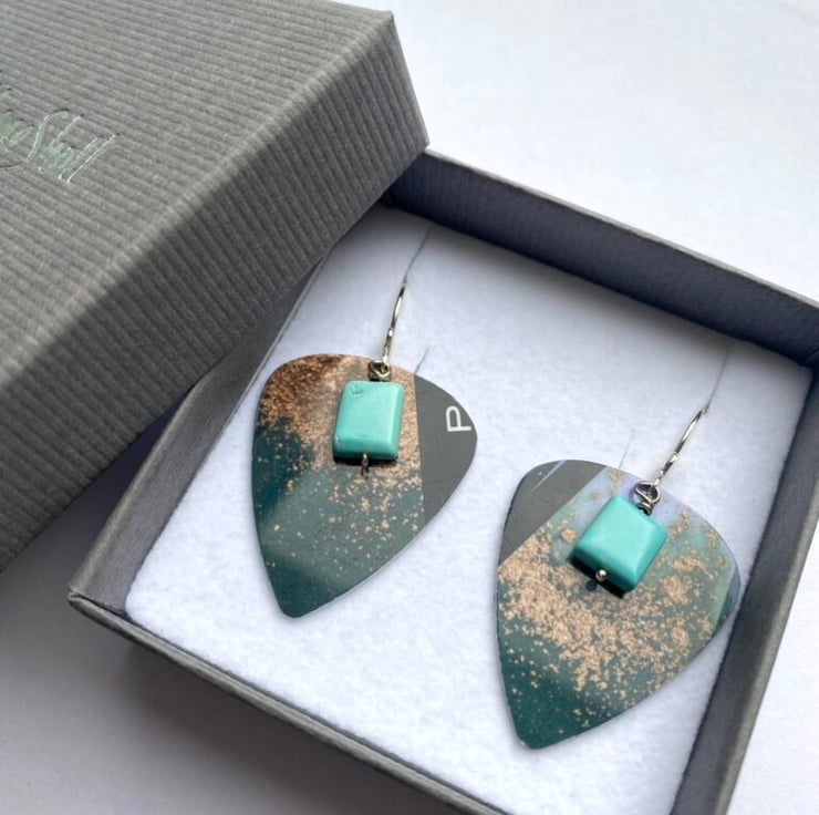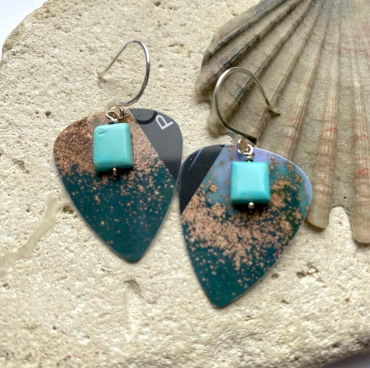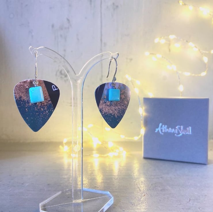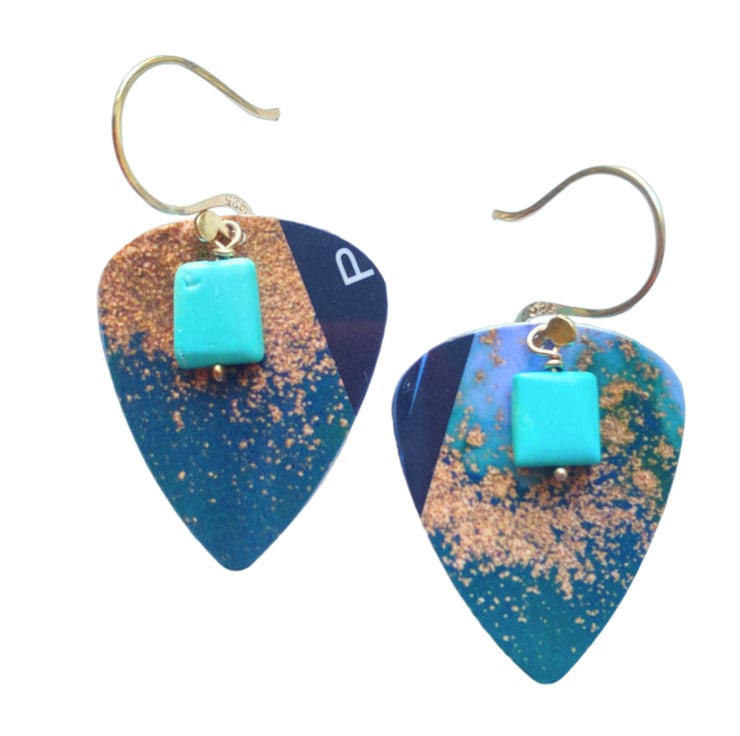 These quirky recycled plectrum dangle earrings have a trendy blue marbled pattern on each which is complemented with a geometric turquoise gemstone square.