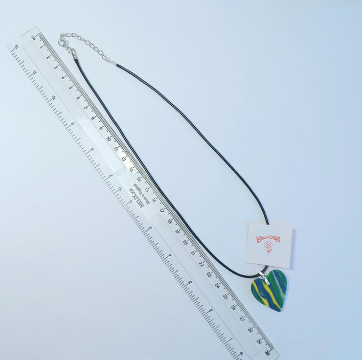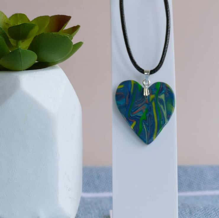 This blue, green and yellow heart shaped pendant was made from a special blend of polymer clay. This pendant comes with a 20 inch black waxed cotton cord which also has an extender chain to allow the wearer to adjust the length if required. Pendant length - 5cm approx. This item is one of a kind and is ready to post.