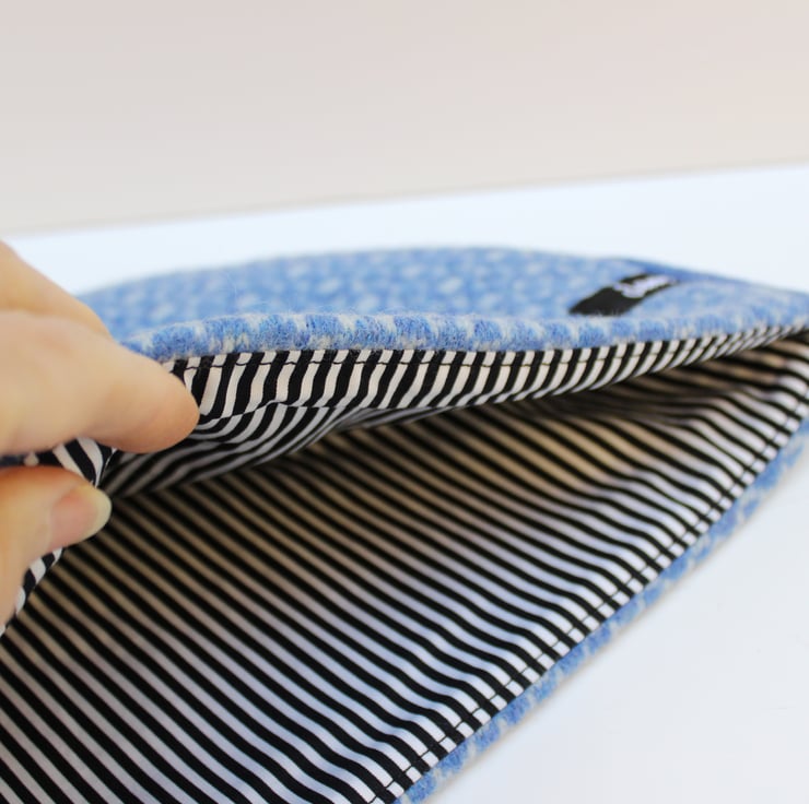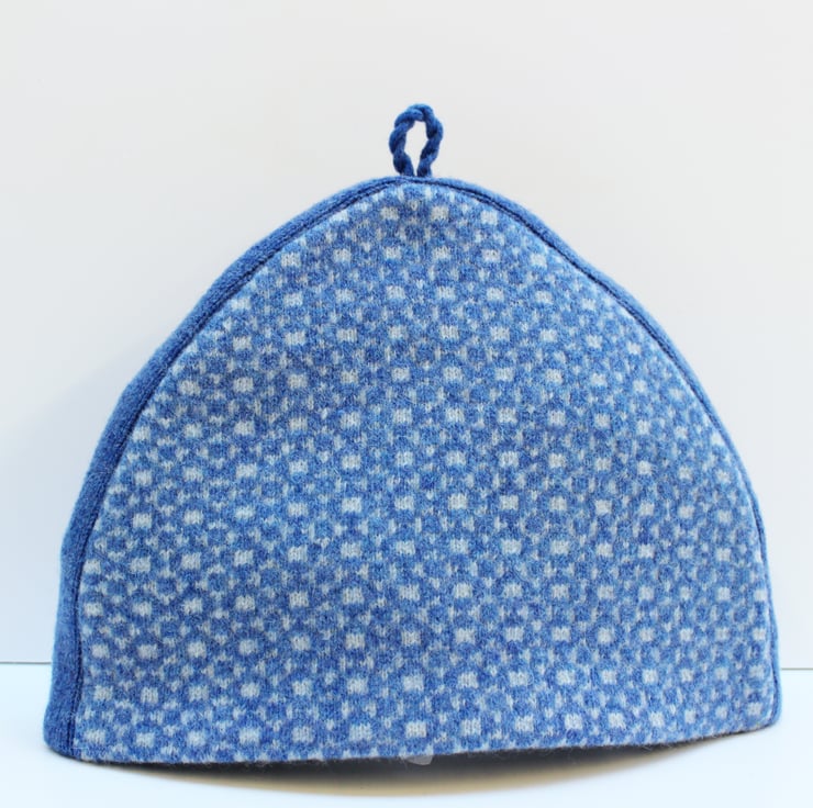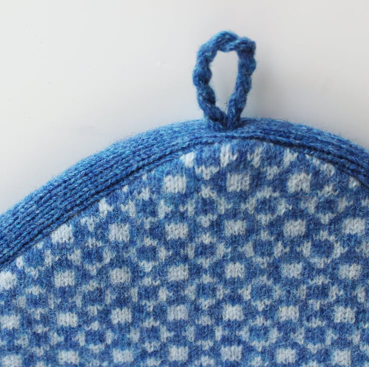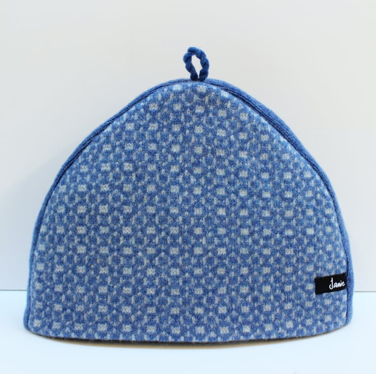 Colourful two tone blue wool knit geometric design tea pot cover with pin stripe black and white cotton lining