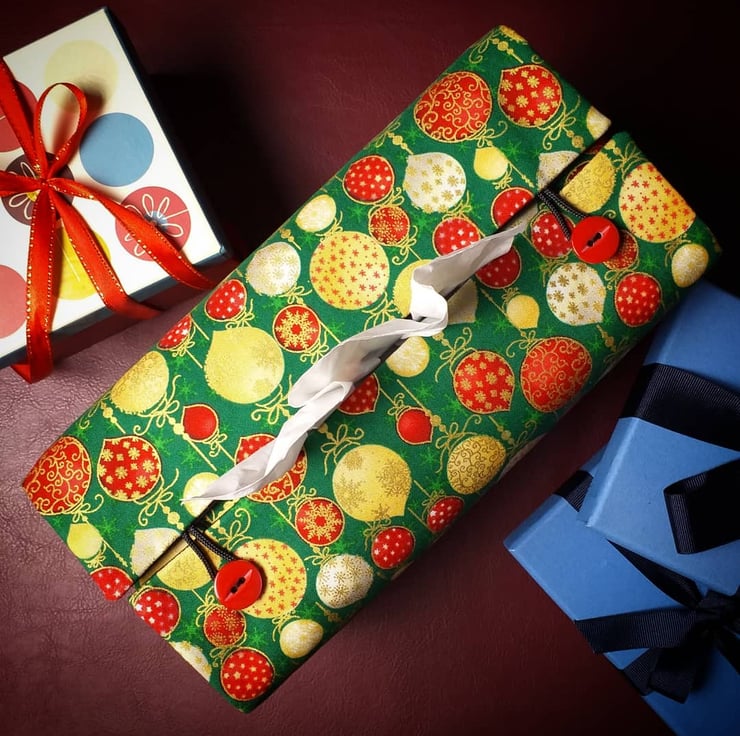 Holiday themed red, gold, and white Christmas baubles with metallic gold accent on green background, and solid black lining. Pattern placement varies.