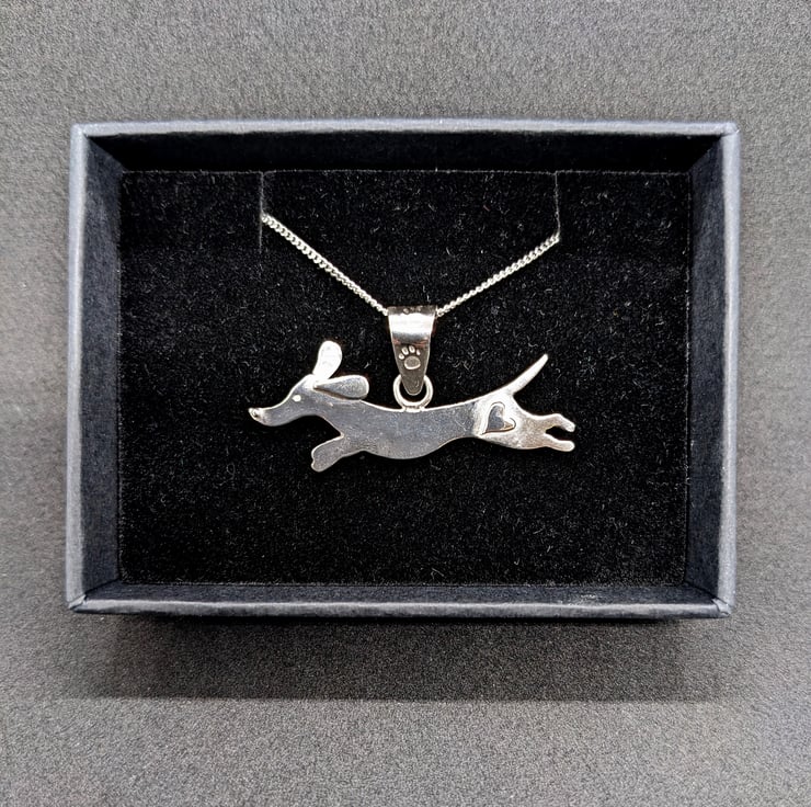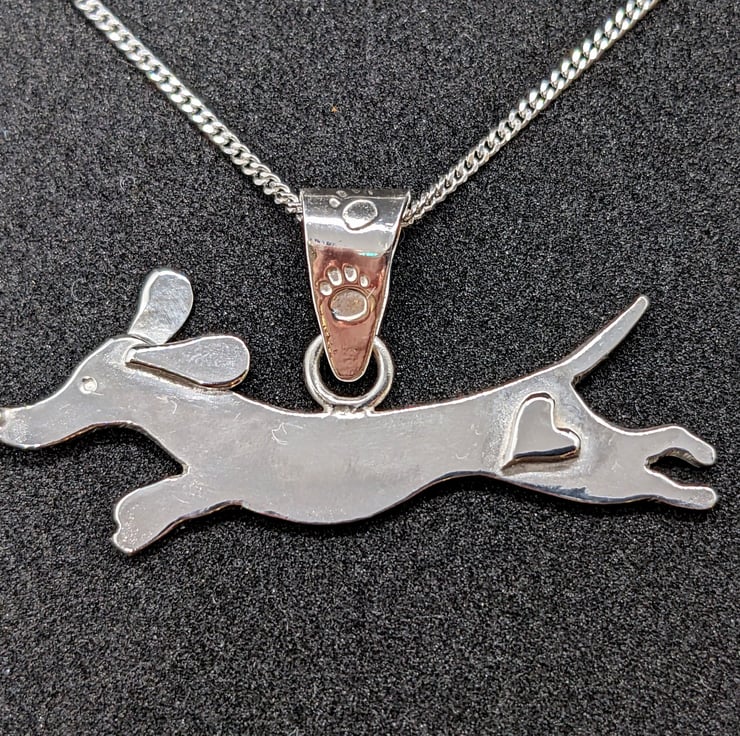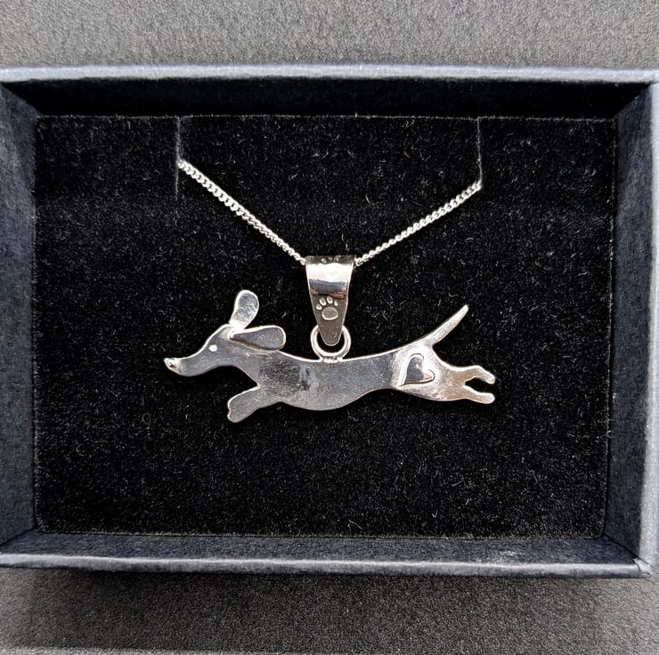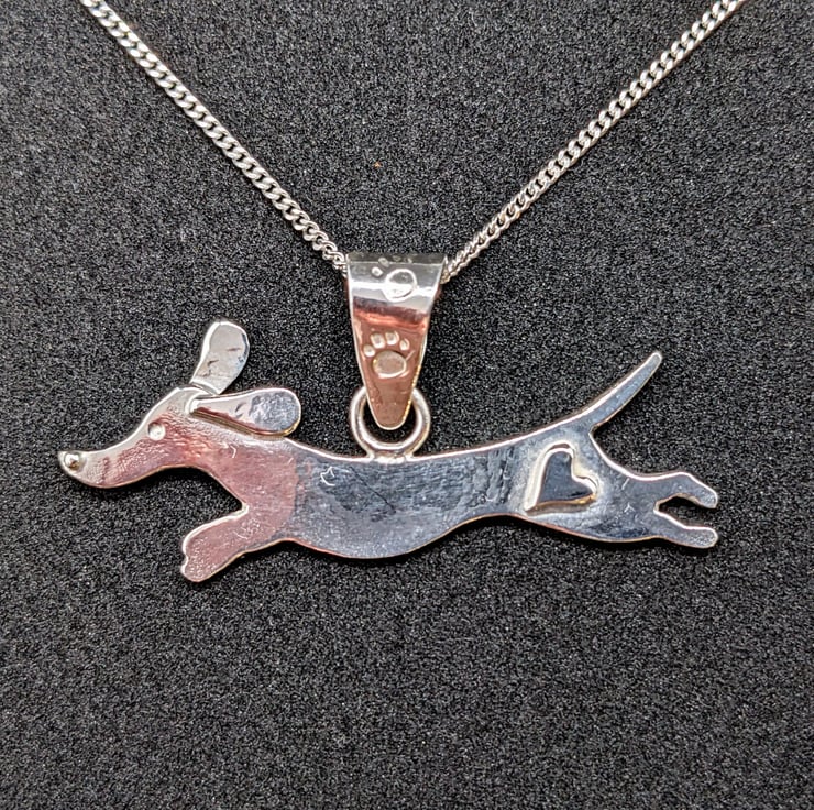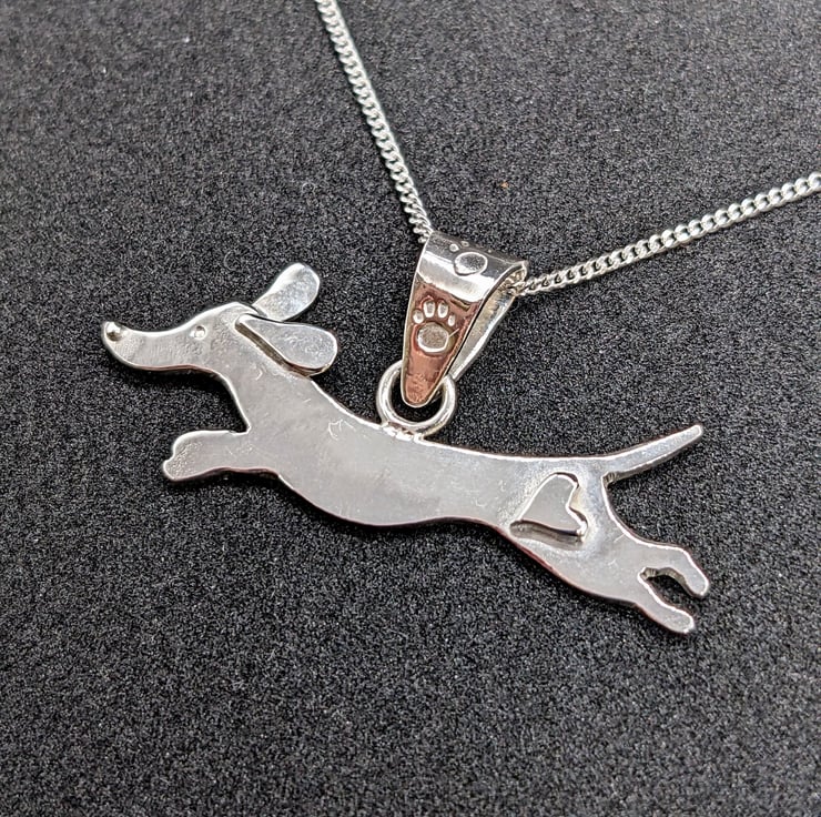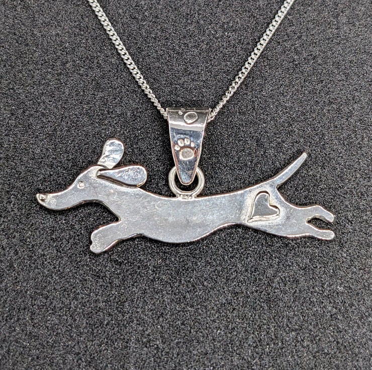 Inspired by a gorgeous miniature Dachshund that I know, this sweet silver pendant would be the ideal gift for anyone who loves dogs. The pendant is hand drawn and saw pierced from recycled sterling silver sheet. It measures 4 cm from the tip of his nose to his back foot. This speedy dachshund has a tiny granulated silver ball on his nose and a sweet hand saw pierced silver heart near his tail. The pendant has a handmade, sterling silver bail decorated with tiny stamped paw prints.