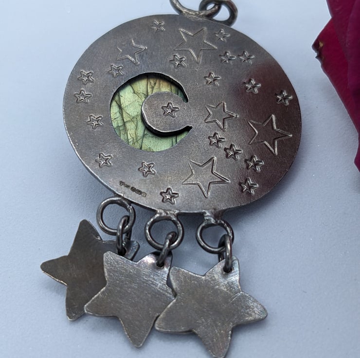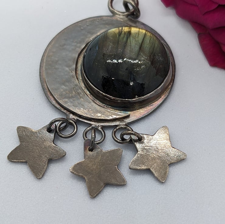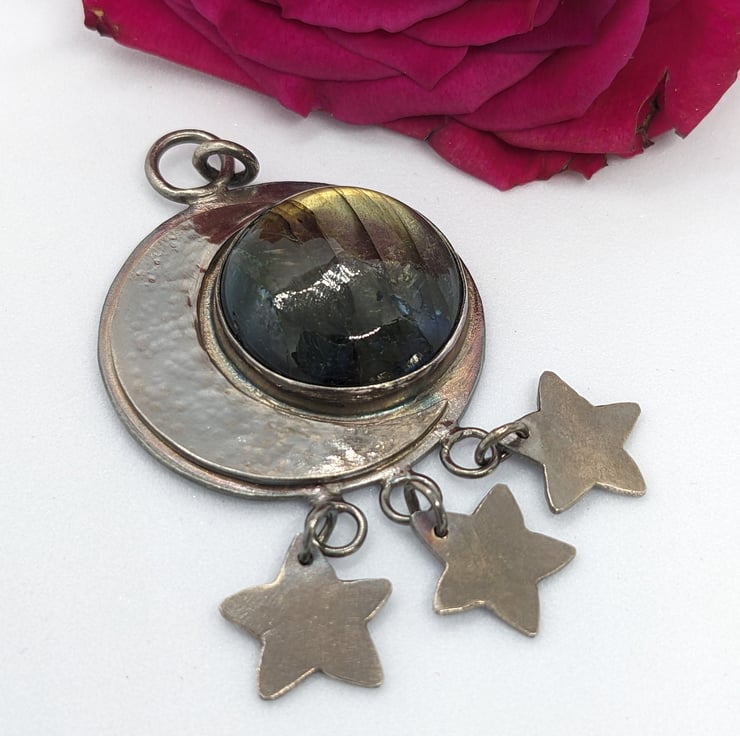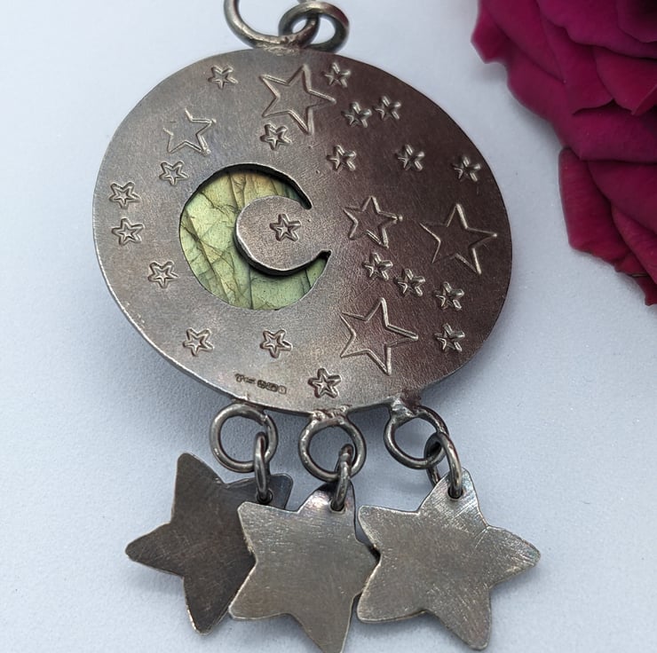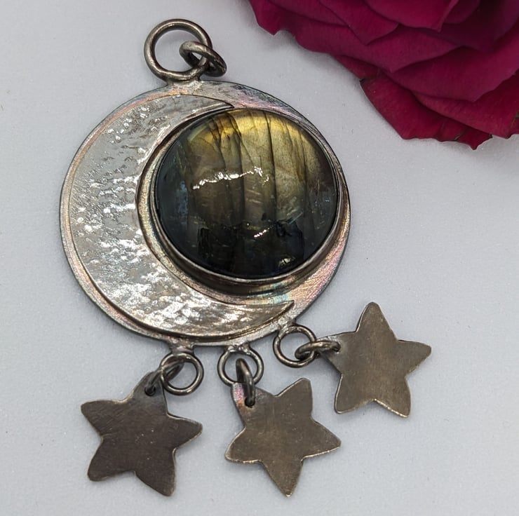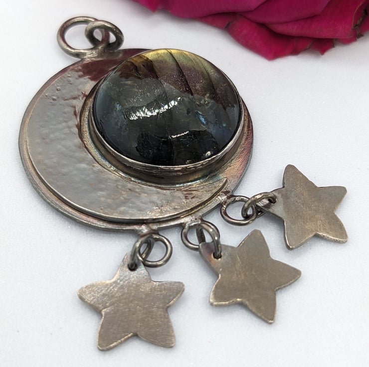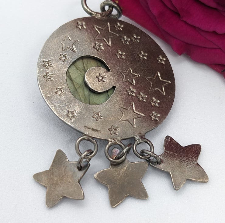 This is a substantial, recycled sterling silver pendant with a hammer textured silver moon and a large round bezel set Labradorite stone. Below the stone hang three individually saw pierced silver stars. The back of the pendant has been stamped with different sizes stars and a crescent moon shape has been pierced behind the stone. The pendant has been treated with an antique finish patina.