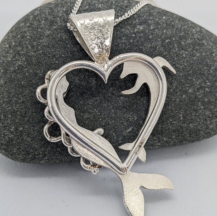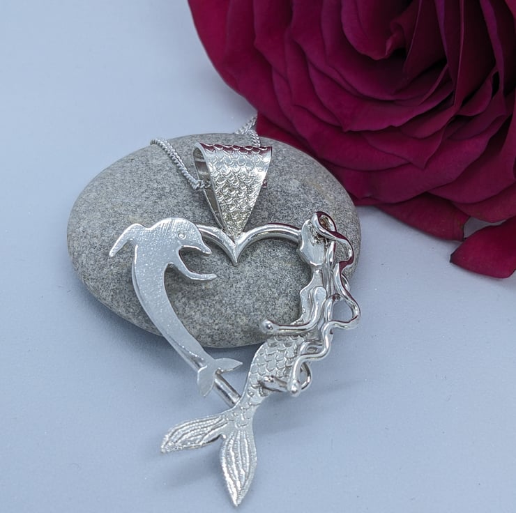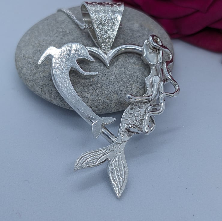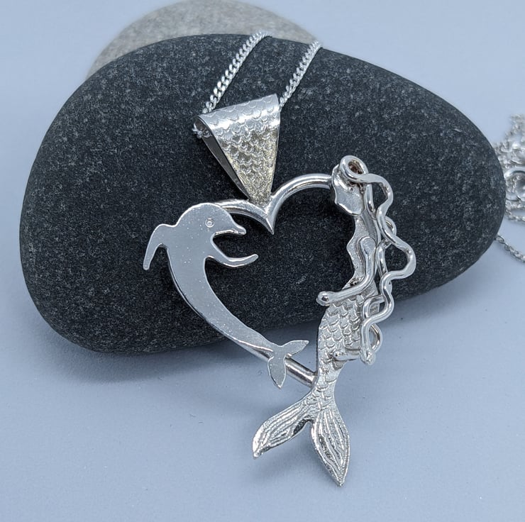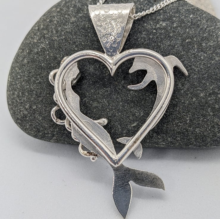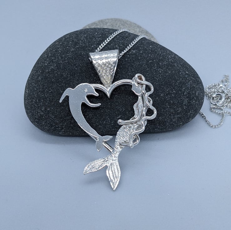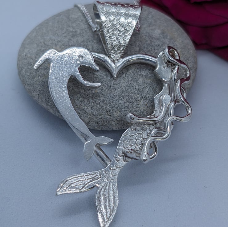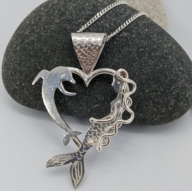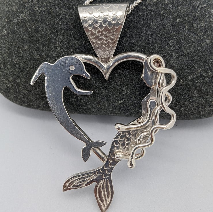 This hallmarked, original sterling silver pendant has been completely handmade. The pendant is based on a handcrafted sterling silver heart. I have drawn a mermaid and saw pierced the shape from sterling silver sheet, applying texture to her beautiful tail and adding sterling silver wire curls. Her companion is a sterling silver dolphin, also handdrawn.