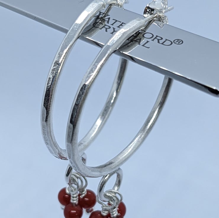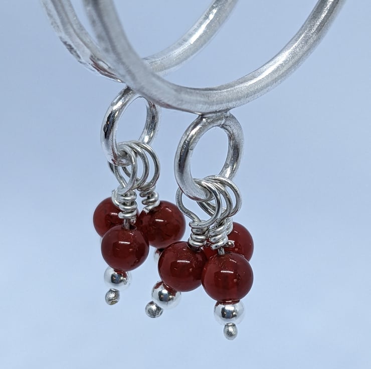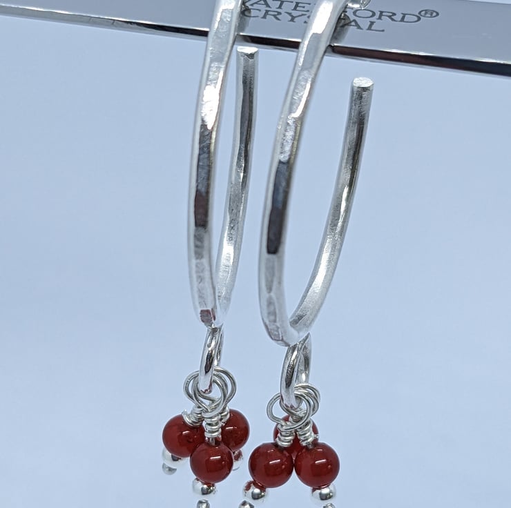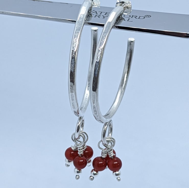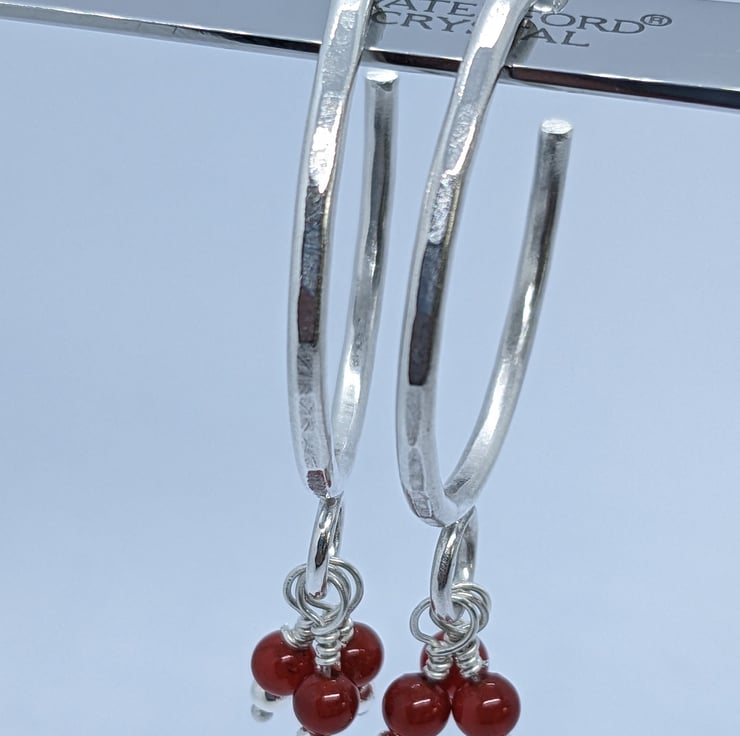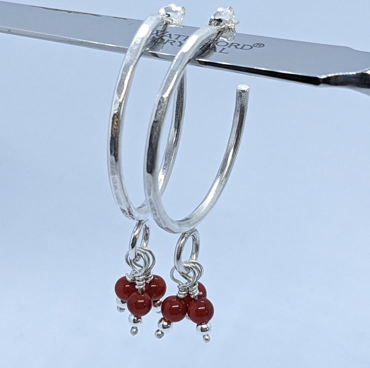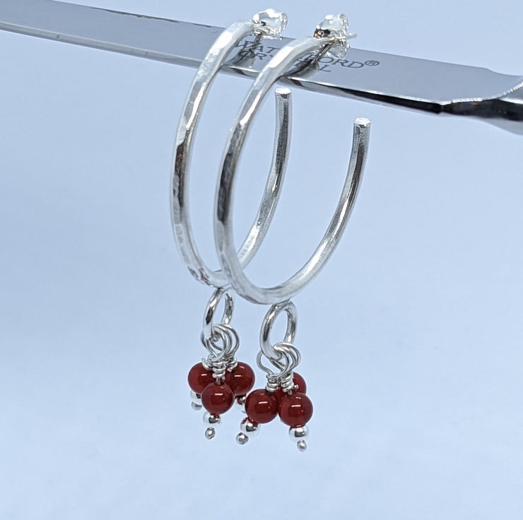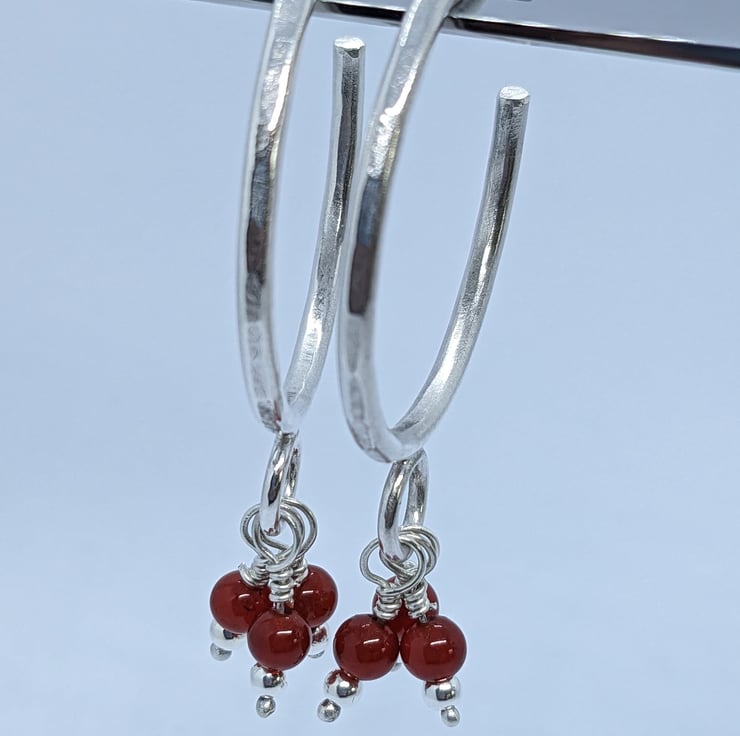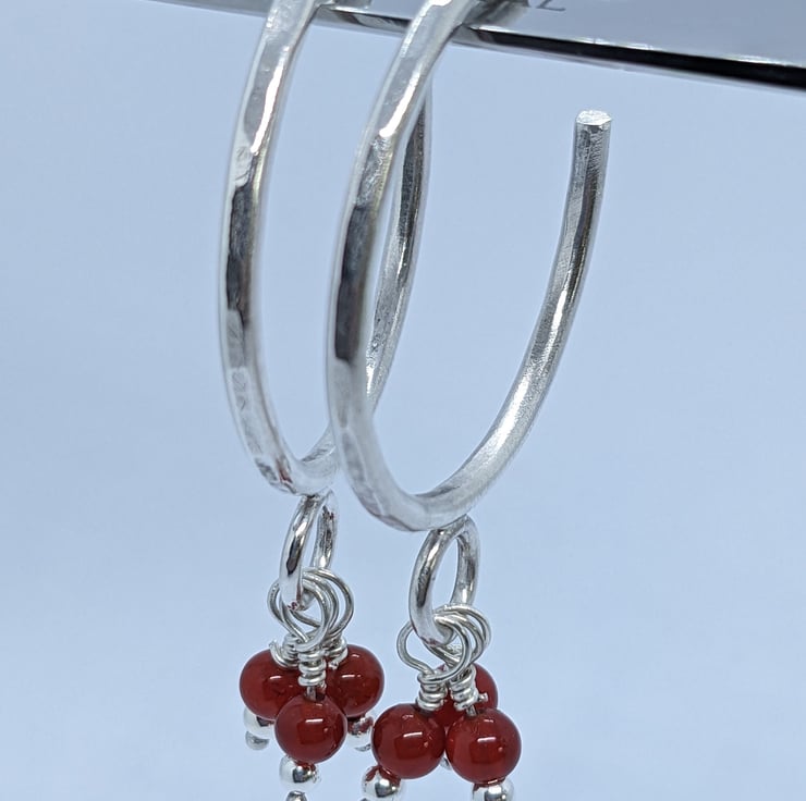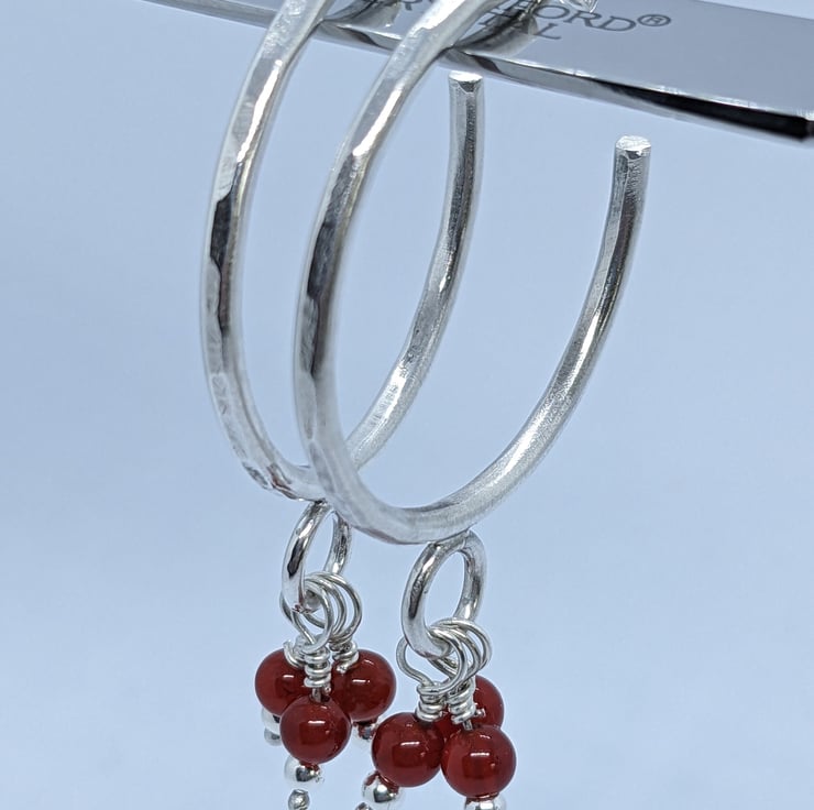 These fun sterling silver, half hoop earrings have been completely handcrafted. Each hoop is approximately 3cm in diameter and made from round wire, that has been hammered to add texture. Wire wrapped beads- one silver and one red agate- dangle from a jump ring at the base of the hoop. The hoops are secured with a butterfly.