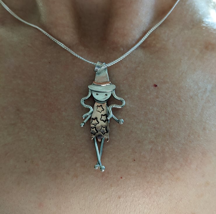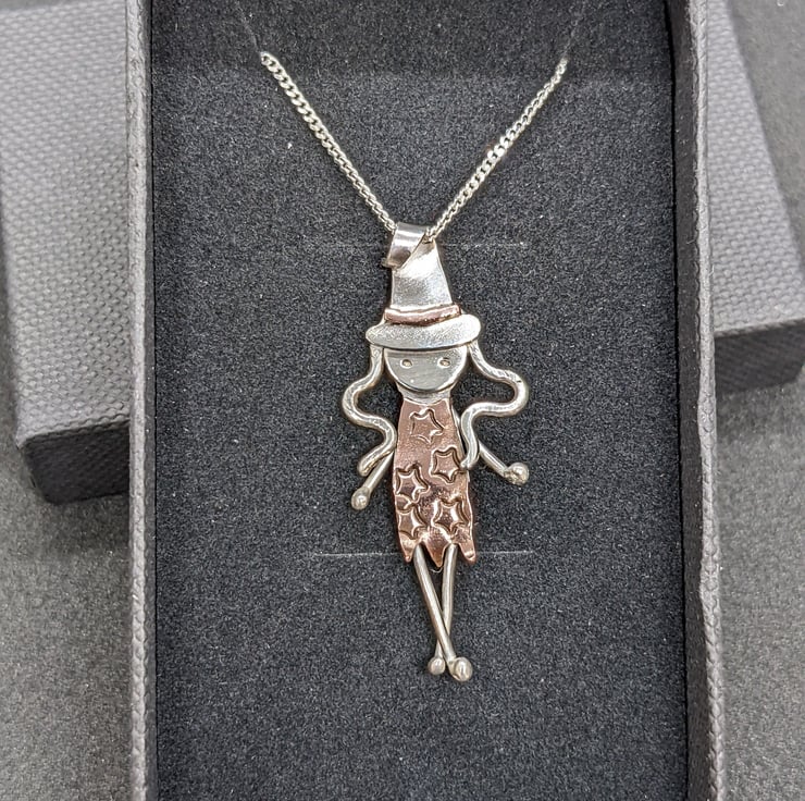 her crooked hat is designed to act as a bail and she comes with a 16 inch, recycled silver, diamond cut, 1.2mm curb chain. She wears a copper dress, stamped with little stars.