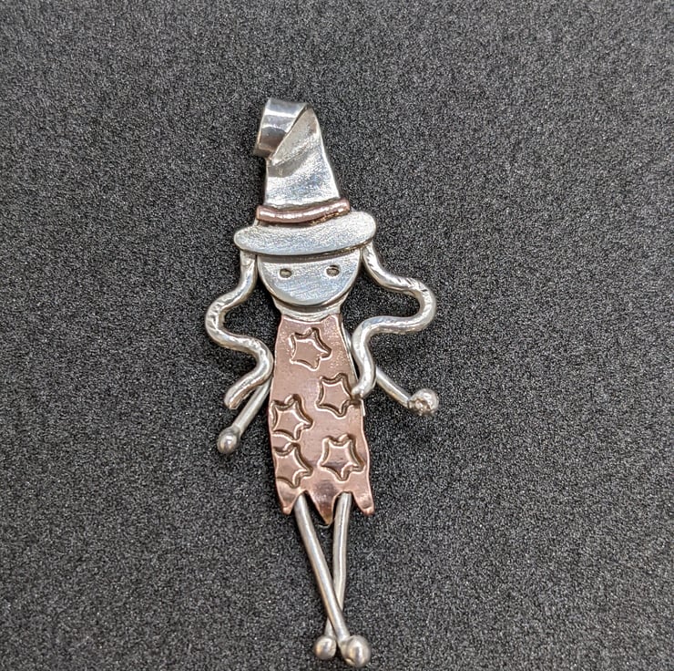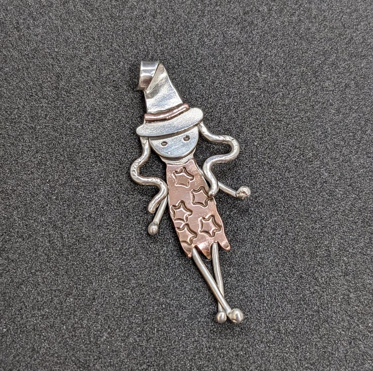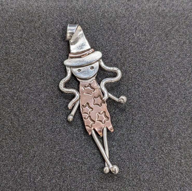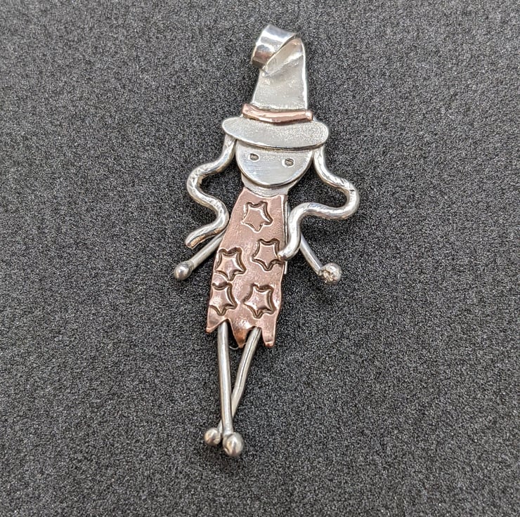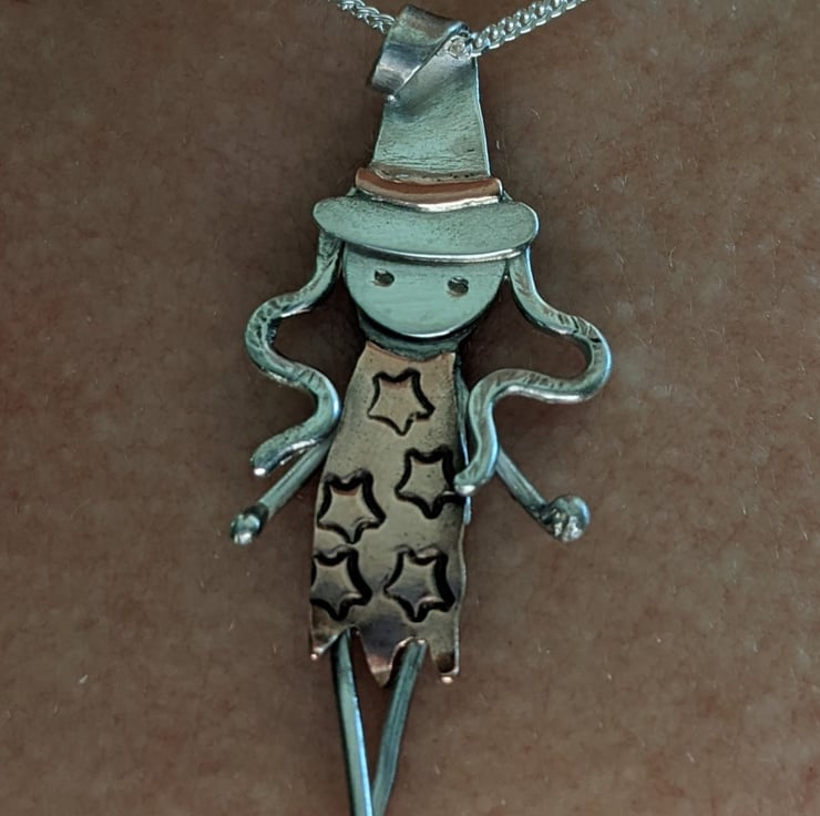 This one-of-a-kind, sterling silver witch pendant measures 4cm, from the top of her hat to the tip of her toes. She has been completely handmade from sterling silver sheet and wire, with copper embellishments.