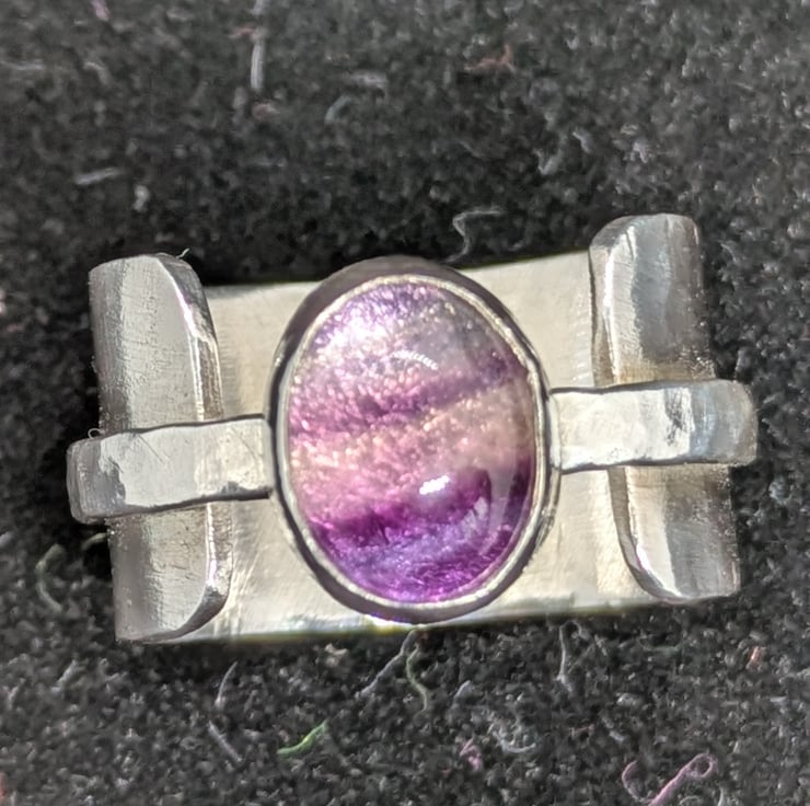 This unique silver ring is made from sterling silver, 1mm thick. The main band is 12mm deep and reaches approximately two thirds of the way around the finger. It is encircled by a slimmer, hammered band, which includes a bezel setting for a fluorite stone. The stone includes attractive stripes in shades of purple. The ring has a rustic but elegant feel and is comfortable to wear.