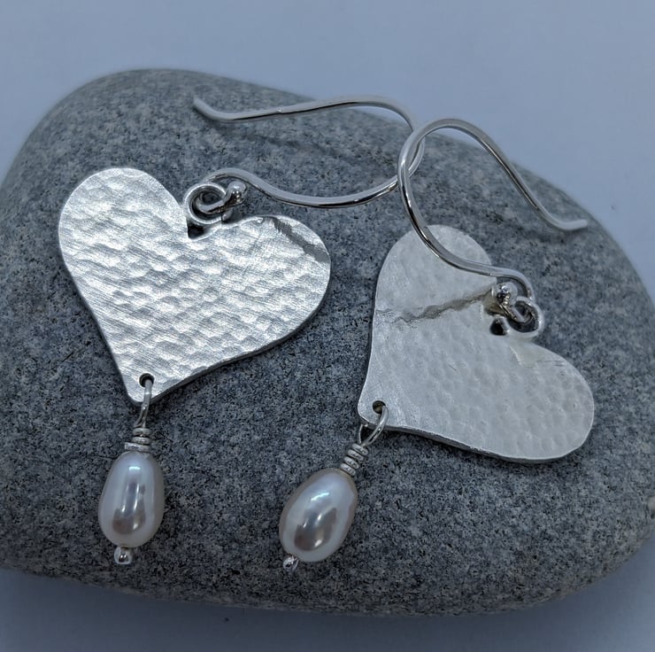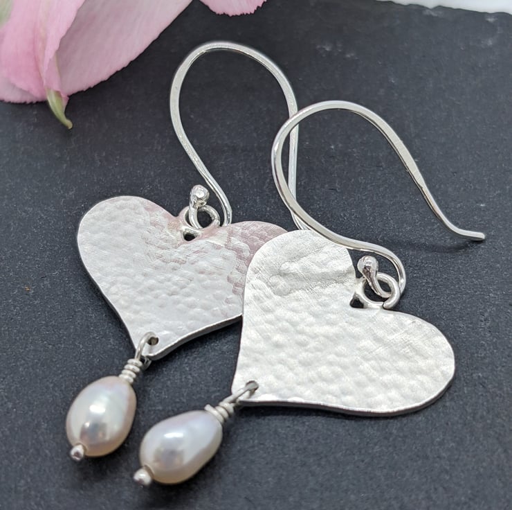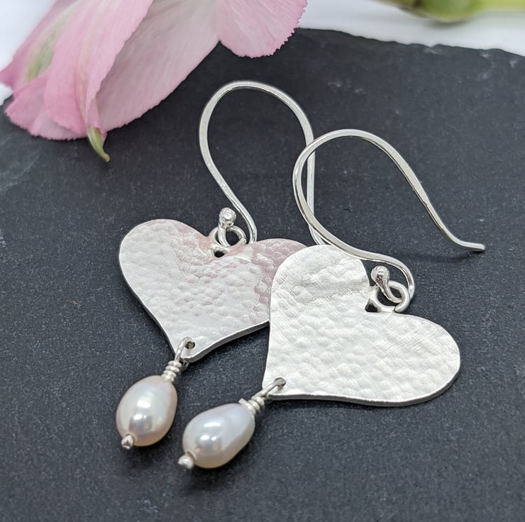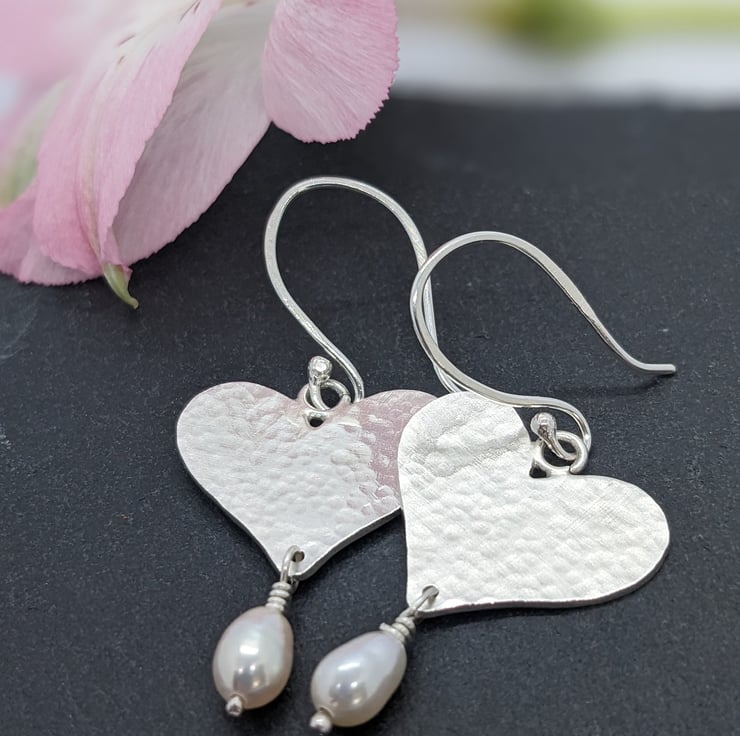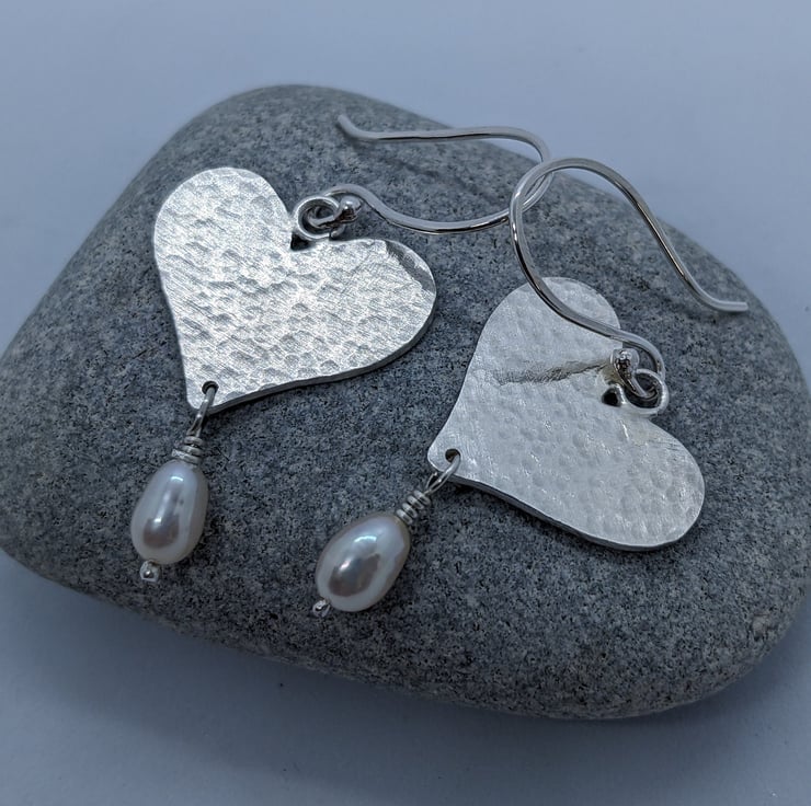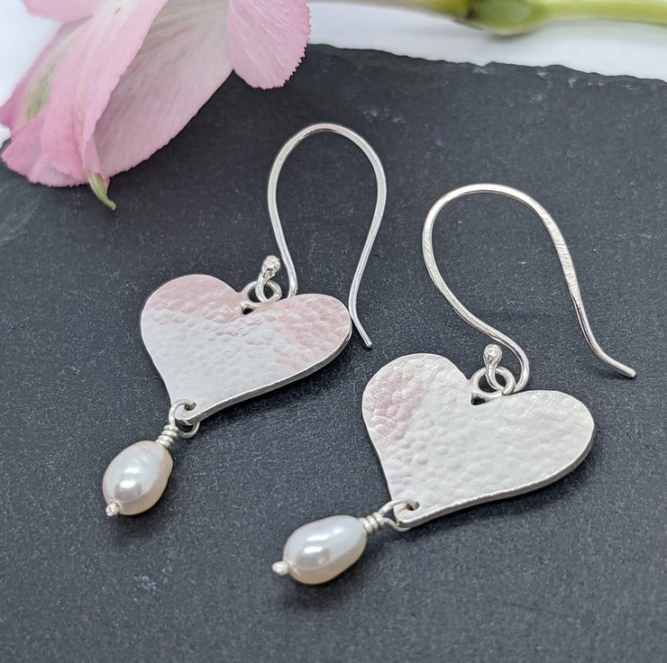 These sweet and elegant sterling silver drop earrings have been completely handcrafted. Each earring is an individually saw-pierced, hand-drawn heart and is made using 1mm thick sterling silver sheet. They have been hammered to add texture and shine and a wire-wrapped cultured pearl bead has been suspended from each one. The ear wires are also handmade from 1.0mm sterling silver wire.