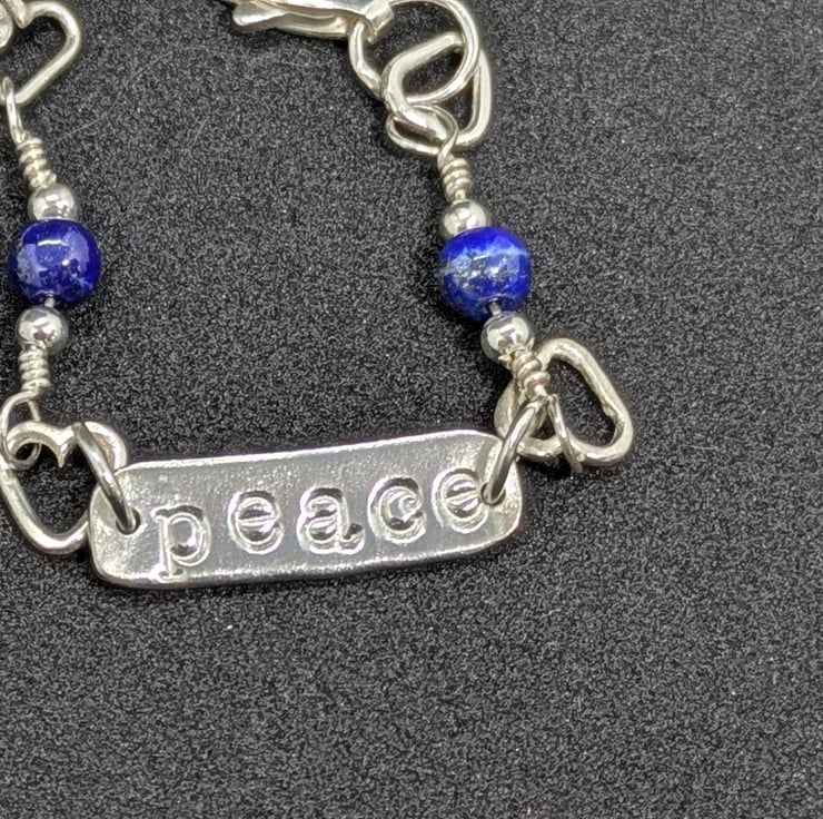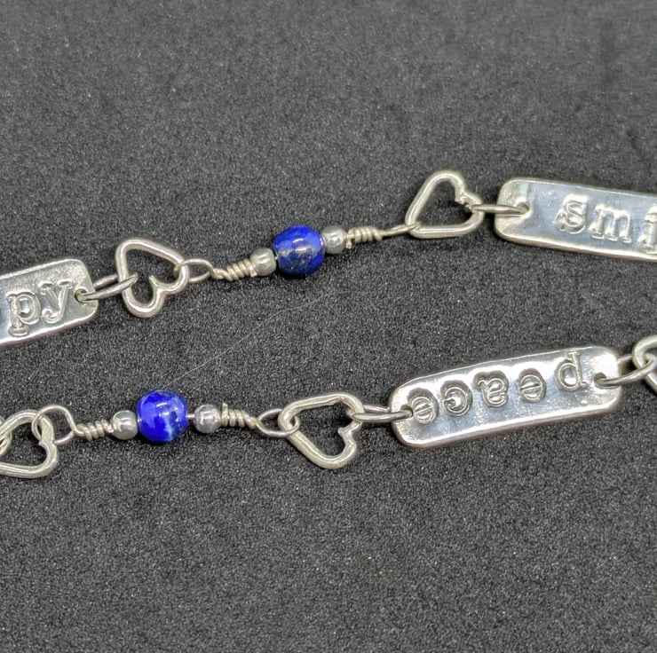 Silver bracelet, Silver bracelet with hearts, lapis beads and stamped sentiments