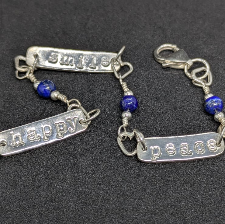This original bracelet features handmade sterling silver charms stamped with the words ' smile', 'peace' and 'happy'. The charms are linked with sterling silver handmade heart links and wire wrapped 4mm lapis lazuli beads and it is fastened with a sterling silver trigger clasp. The bracelet is presented in a black cardboard box and would make a unique and original jewellery gift.