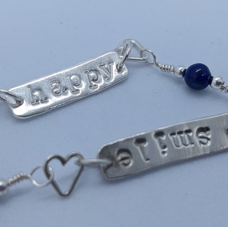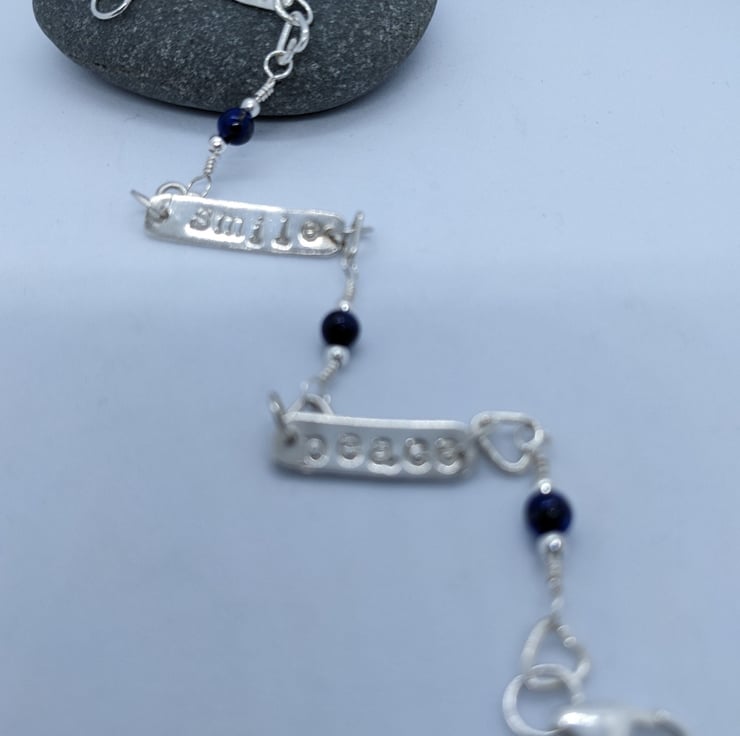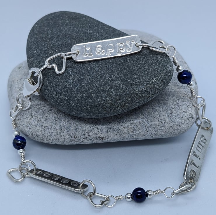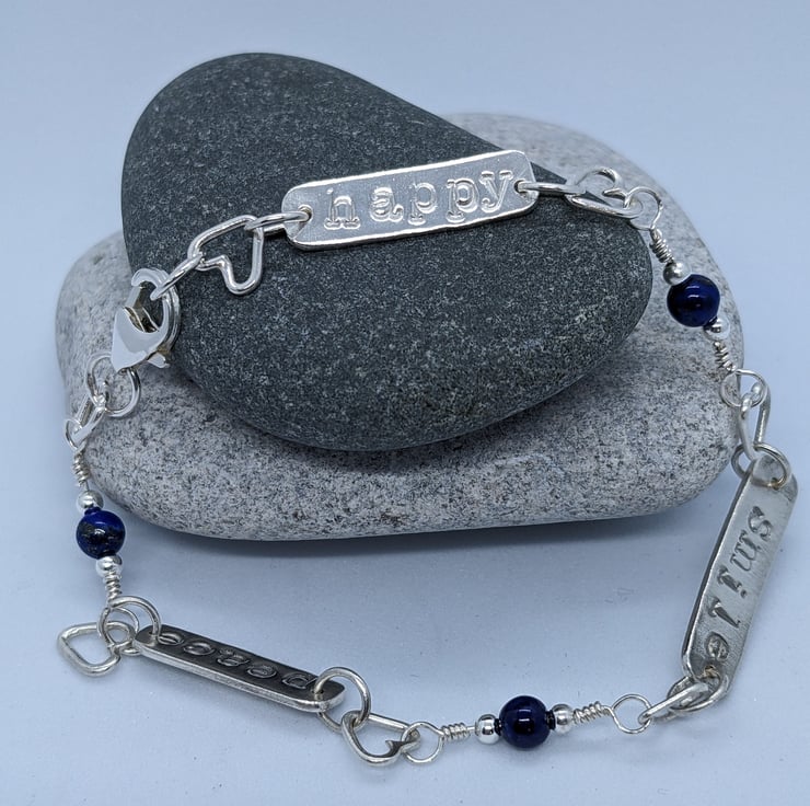 This original bracelet features handmade sterling silver charms stamped with the words ' smile', 'peace' and 'happy'. The charms are linked with sterling silver handmade heart links and wire wrapped 4mm lapis lazuli beads and it is fastened with a sterling silver trigger clasp. The bracelet is presented in a black cardboard box and would make a unique and original jewellery gift.