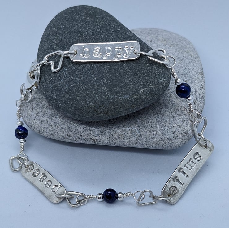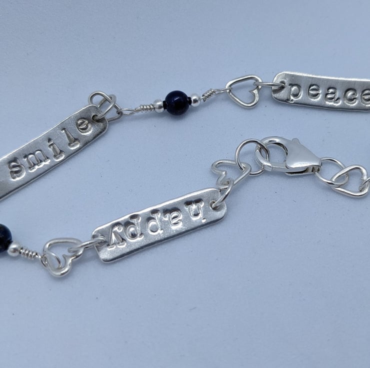 Silver bracelet, Silver bracelet with hearts, lapis beads and stamped sentiments