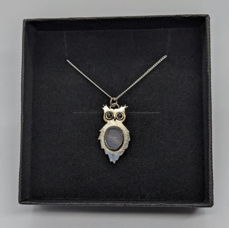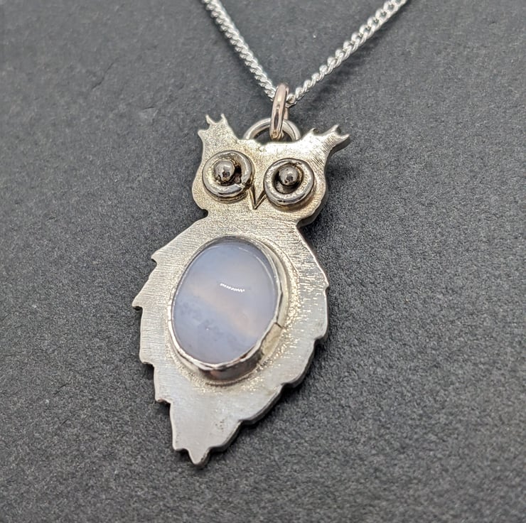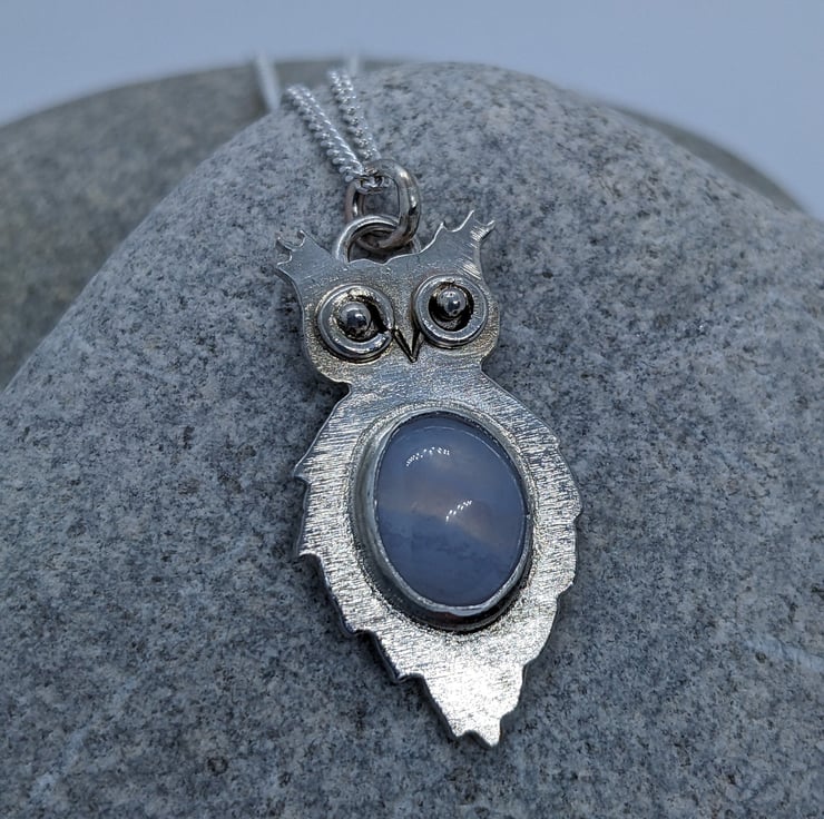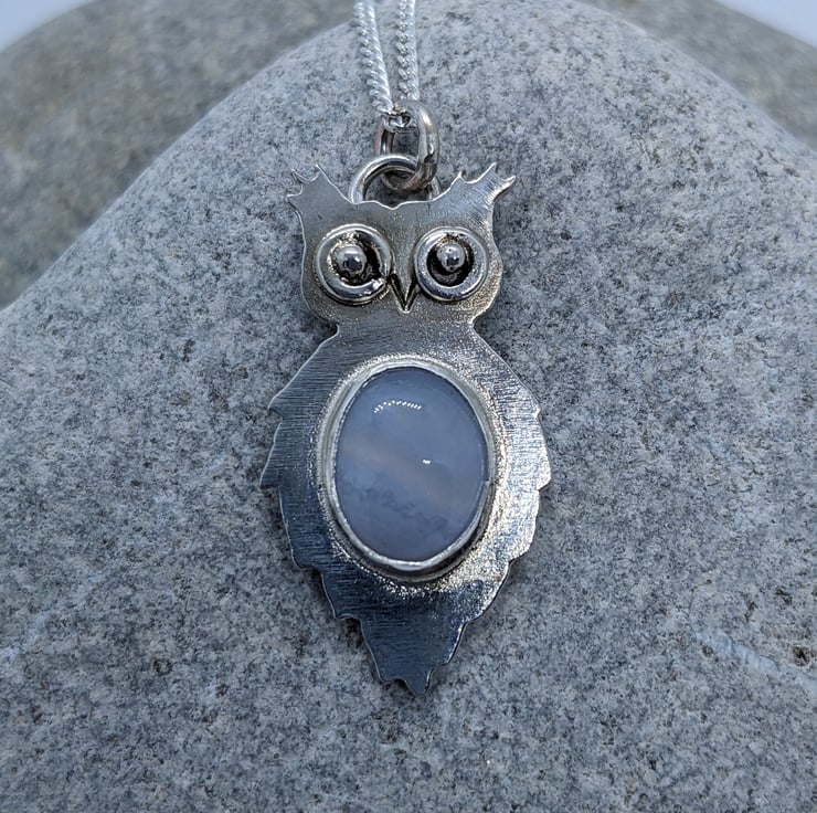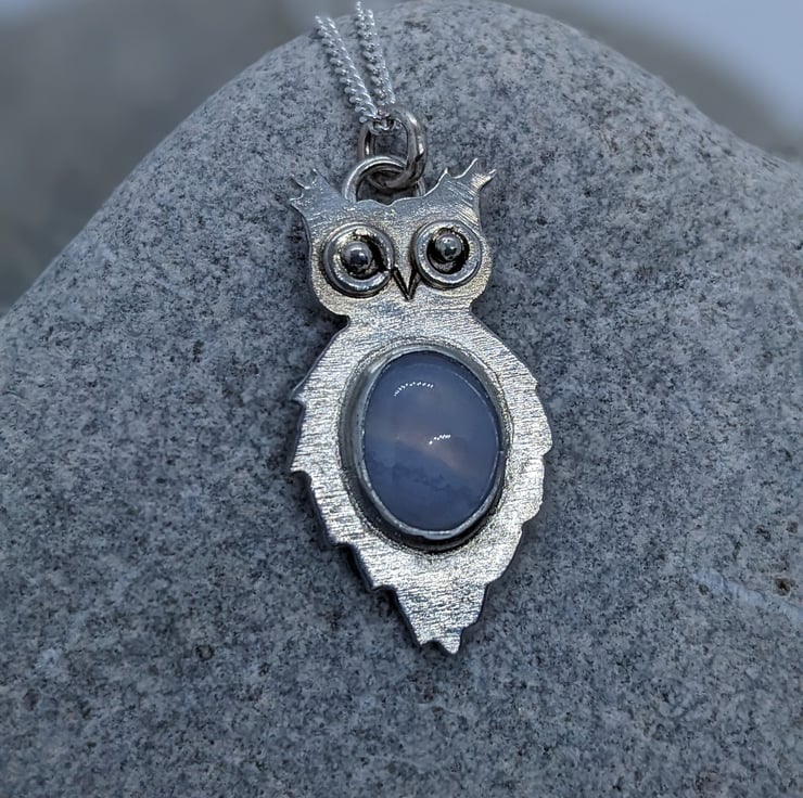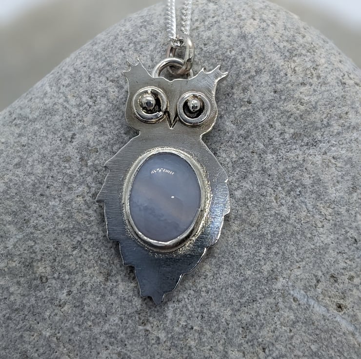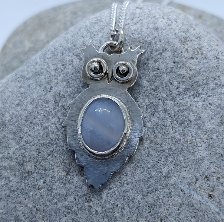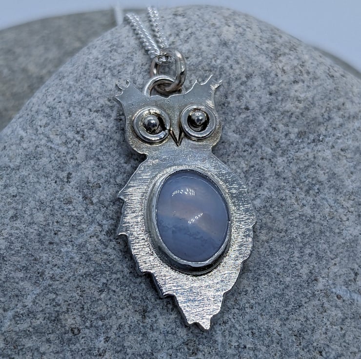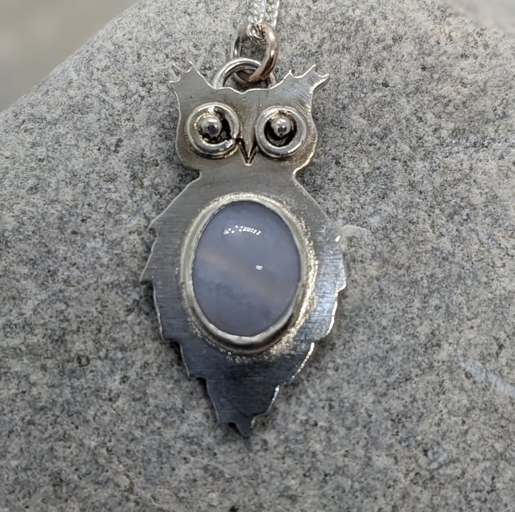 This unique, sterling silver owl pendant is completely hand saw pierced from 1.1 mm sterling silver sheet. His distinctive eyes are made from tiny handmade hammered jump rings and have granulated silver ball centres. The pendant is bezel set with a pretty Blue Lace Agate cabachon- its delicate, pale blue tones put me in mind of the moon, which I thought was an appropriate choice for an owl. He measures approximately 2.8cm by 1.5cm and he is hallmarked.