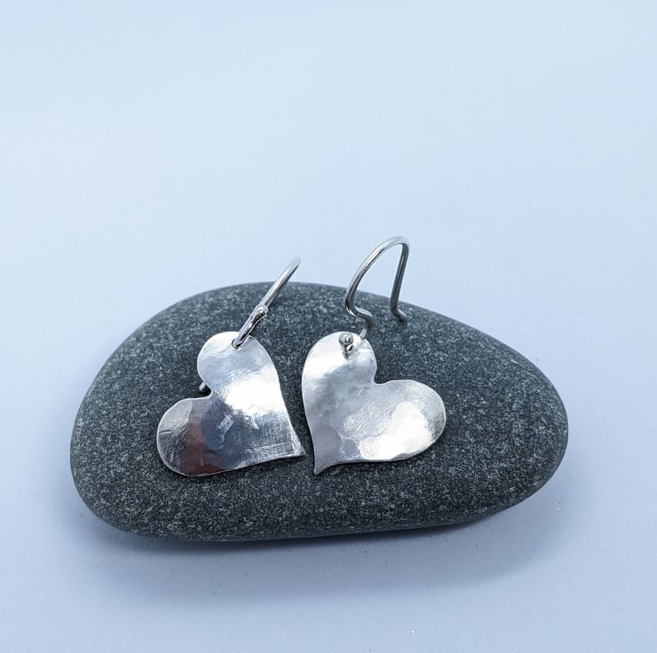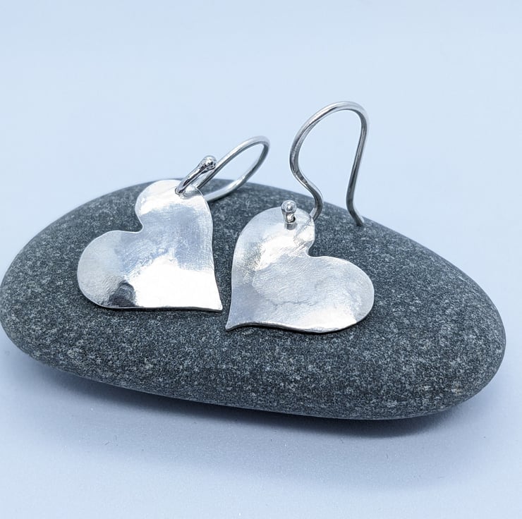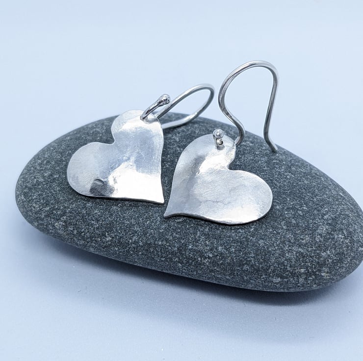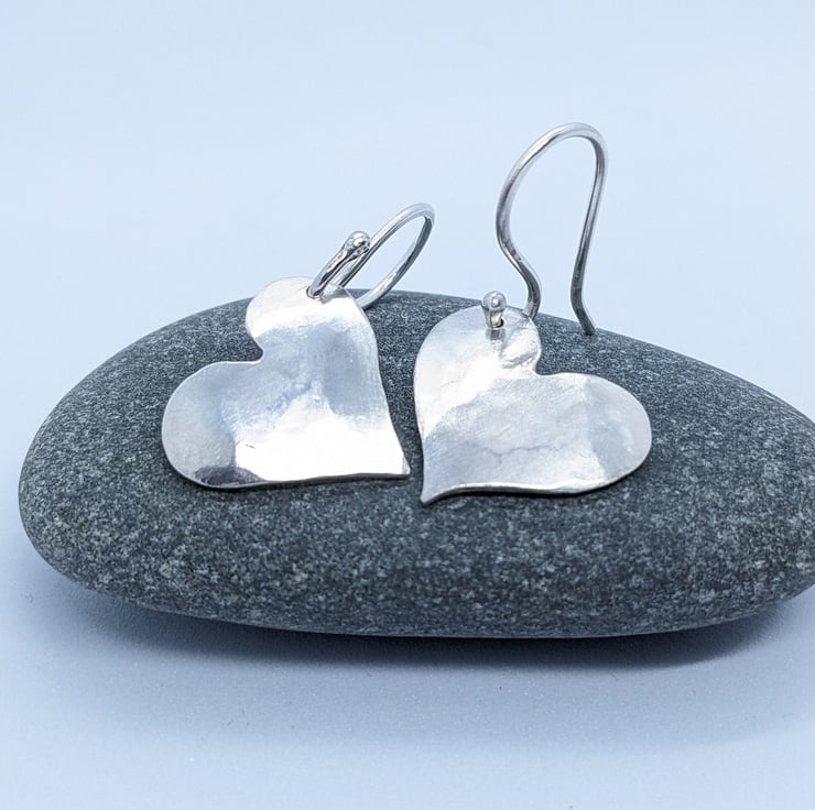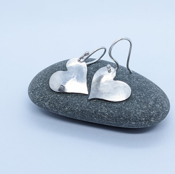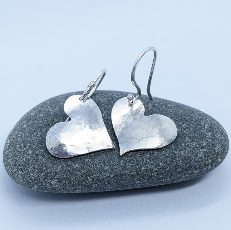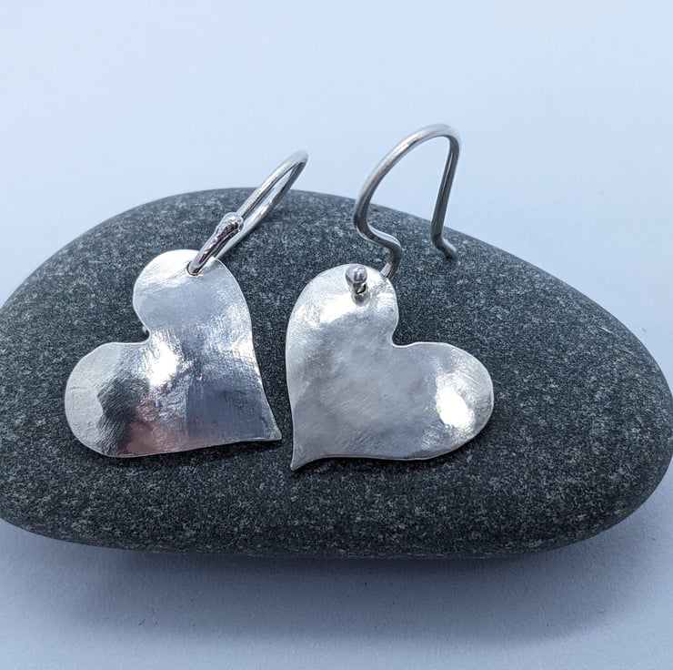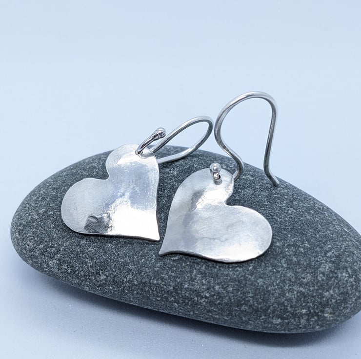 These sweet sterling silver drop earrings have been completely handcrafted. Each earring is an individually saw-pierced, hand-drawn heart and is made using 1mm thick sterling silver sheet. They have been hammered and slightly domed. The hearts are drilled on opposite sides, so that they are a reflection of each other. The ear wires are also handmade from 1.0mm sterling silver wire.