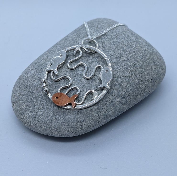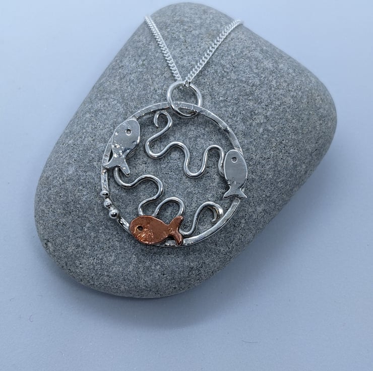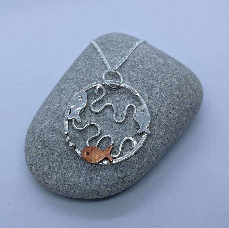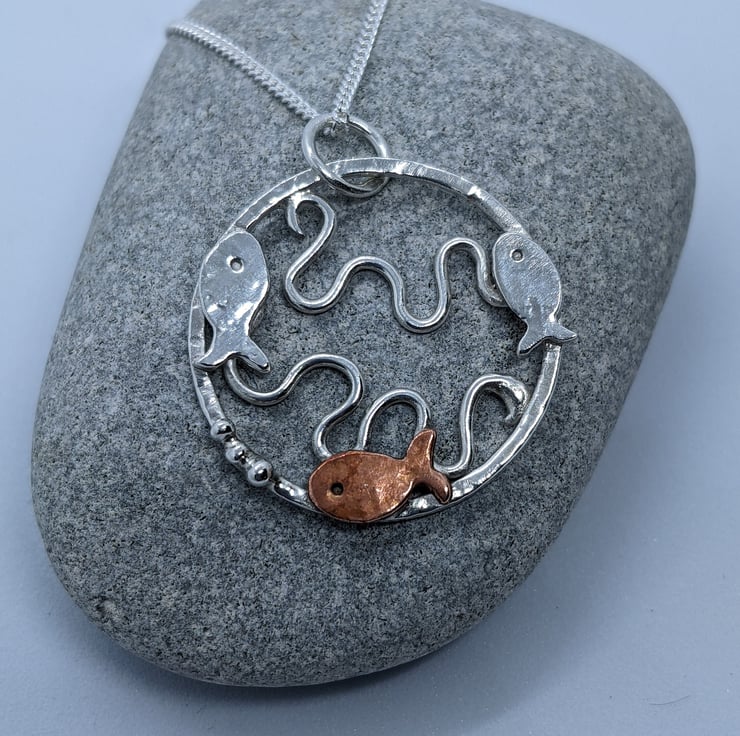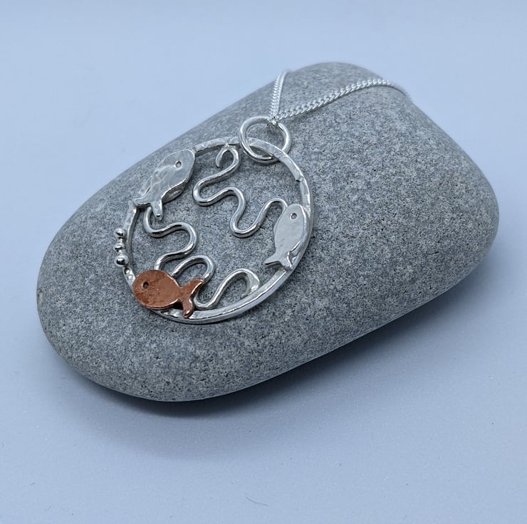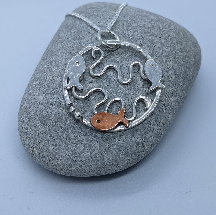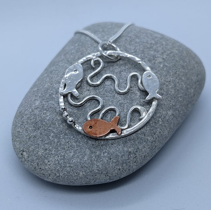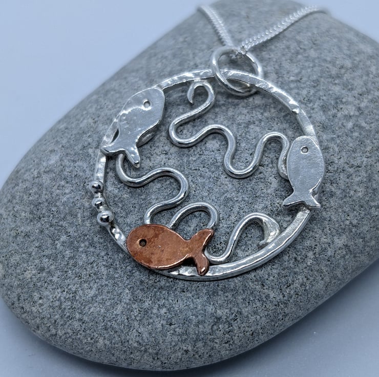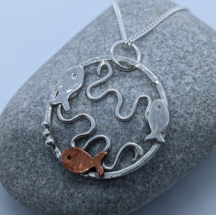 This Sterling silver pendant has been completely handmade from sterling silver wire and decorated with copper embellishments. The pendant is a textured sterling silver ring with three tiny silver and copper fish swimming around the edge; two silver and one copper. The copper fish has three tiny silver granulated bubbles coming from its mouth. Within the silver circle, silver wire has been shaped into waves to represent the sea. A silver jump ring has been attached to the pendant to connect it to the chain.