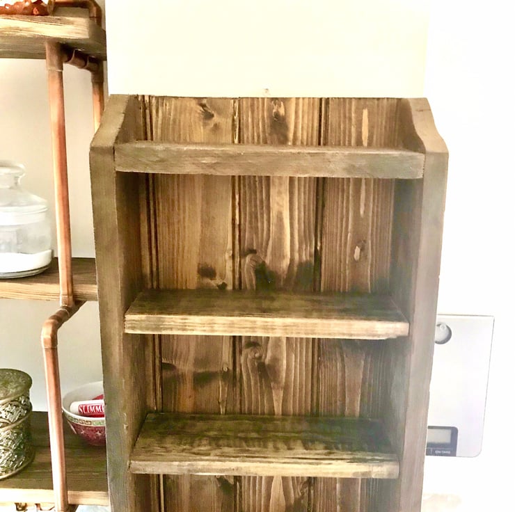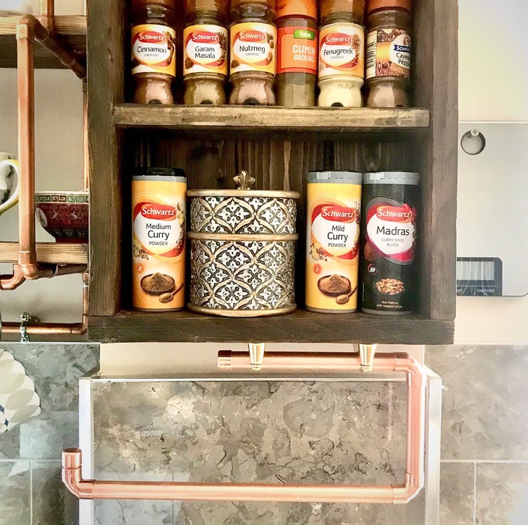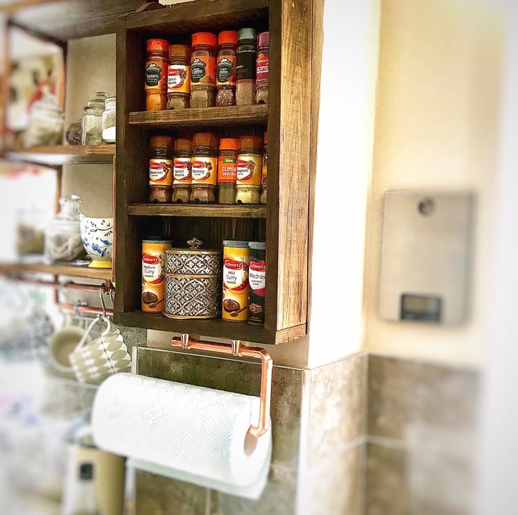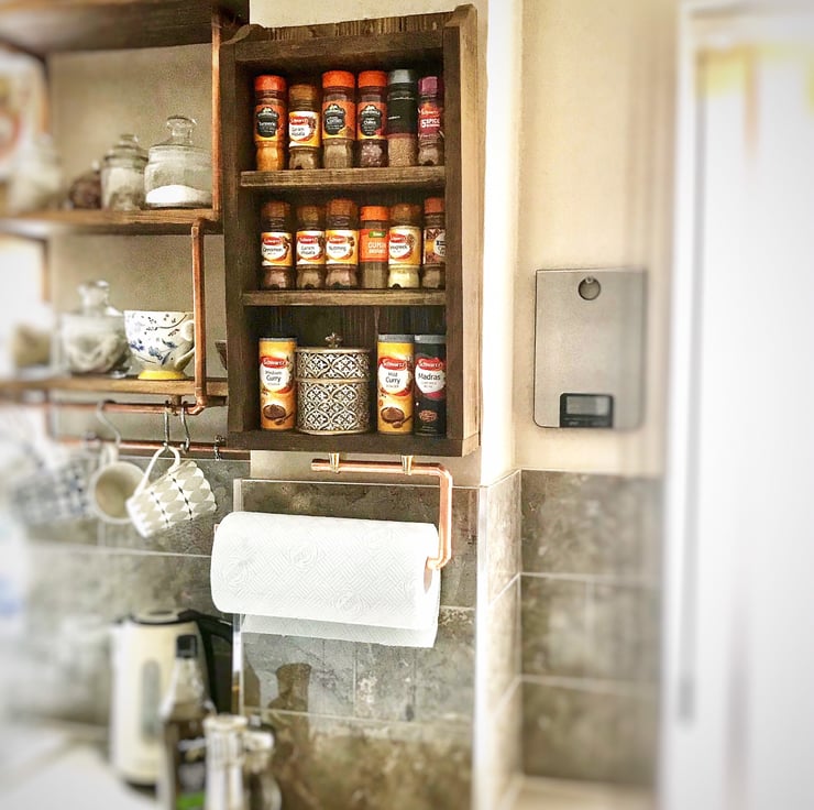 Yet another one of our Kitchen Culinary Delights! This clever and good looking piece is a really Bright Idea:) Lots of room for those herbs and spices. The copper pipe bar adds a bit of class and warmth to the final look of this useful bit of furniture as well as it being a natural pure metal, and..it holds more than Juan Sheet hehe.