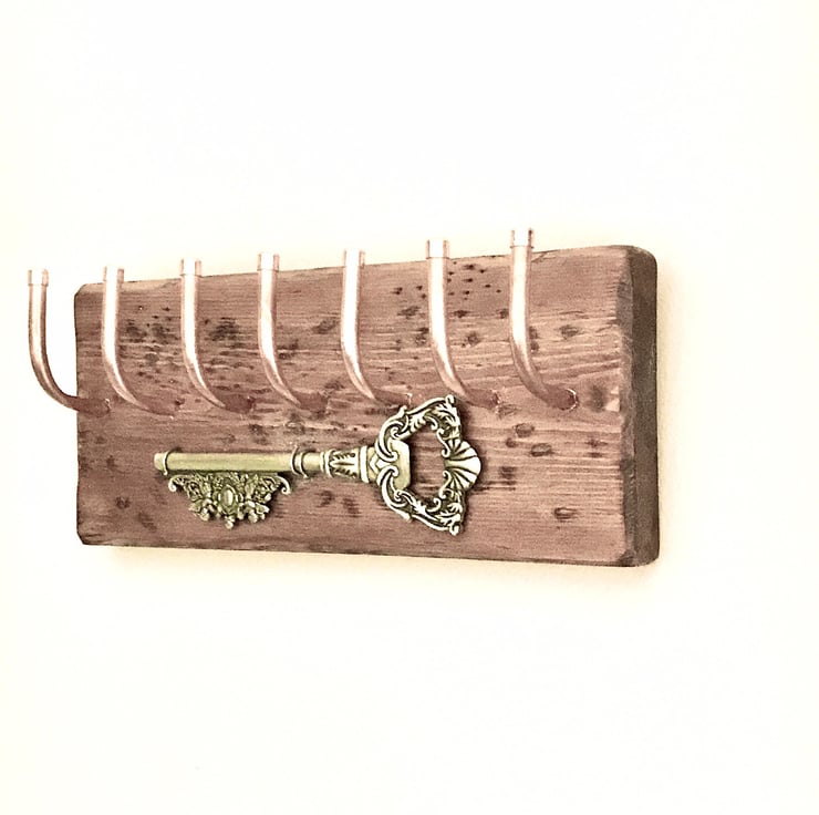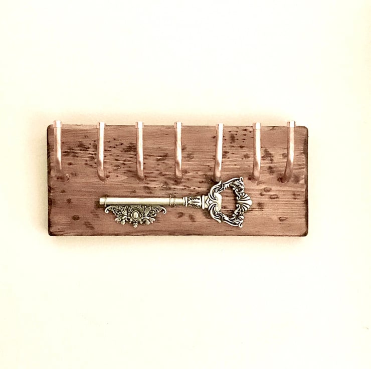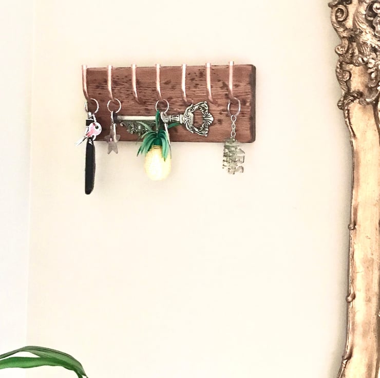 This Timber and Copper Piece is Attractive with an inset, Ornate Pewter Style Key. Hang those important keys up ASAP! Youll never lose them. A cute gift for a friend or relative, everyone can find a space for one of these. Handmade with care and love and this piece is fun to look at as well as so very useful. We choose the best quirky timbers when we make them. The more rustic the better as this is a striking contrast against to brilliant copper hooks. These hooks are fashioned to fit this timber so as to give 7 hooks for all those house and car keys.