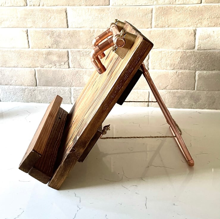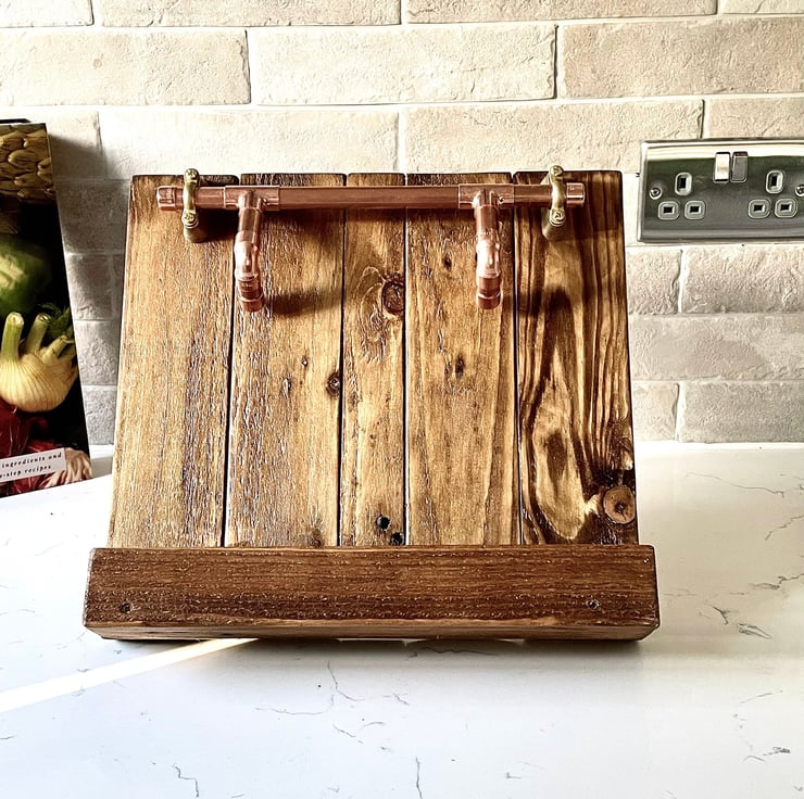We designed this with great care and attention as were brilliant at cooking here! Old Timber with its grain enhanced by us using a Rich Acorn Oak Stain that we mix and create ourselves. Sealed with a tough finish to make it easy to wipe clean. Zoom right in and Take a closer look at the photos in our listing here and see the copper details as well as the clever practical way it functions. This is such a fabulous gift too for that keen cook and cake maker. Then when cookings done, get the sheet music out and strum a few chords. The natty little flip up & down copper stay will hold a piece of paper tight too when you want that sheet of paper recipe to refer to as well as the hand written ones that mammy has scribbled down for you.