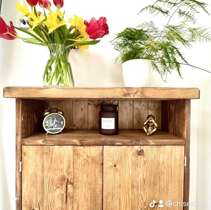 This console style cabinet is neatly designed for simplicity yet very practical. It has a certain rustic appeal with little quirks in the timber and the making. Lovely Internal shelving to house your personal things as well as books etc. Whats not to love!