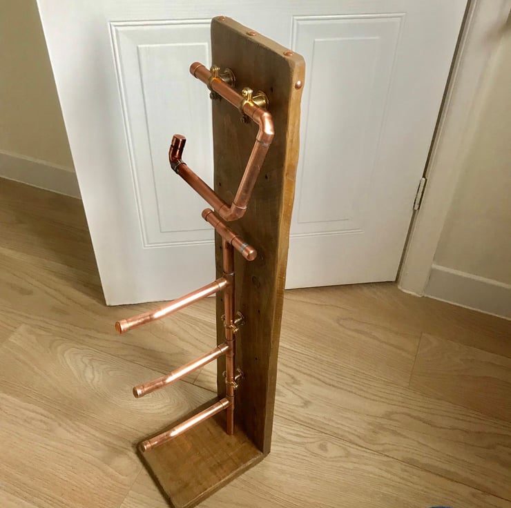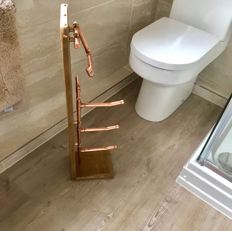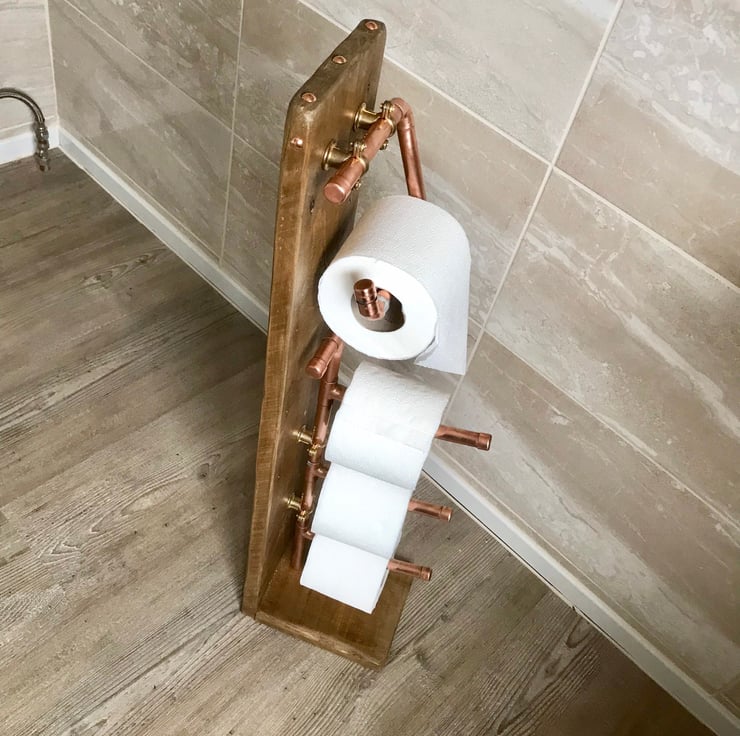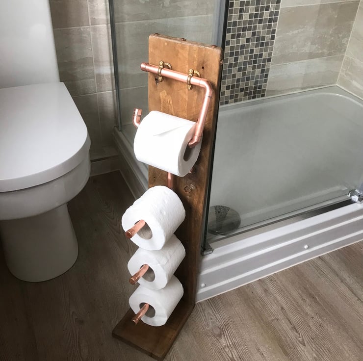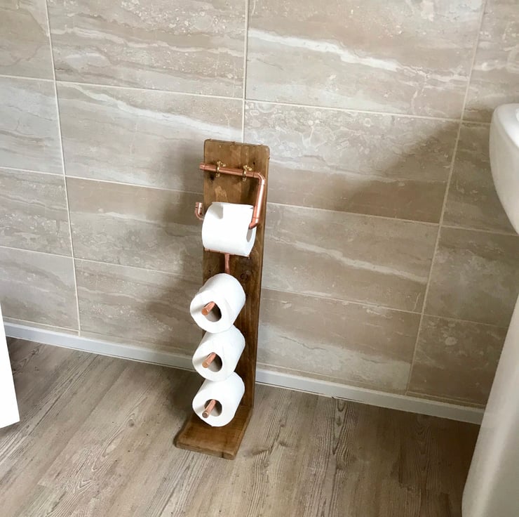 A Timber and Copper Floor Standing Toilet Roll Dispenser. Holds 4 rolls in total. The top one for the roll in use being the moveable part. The this Attractively designed dispenser hols 3 more for convenient way to store your essentials. The copper is a stunning contrast against the Aged Timber.
