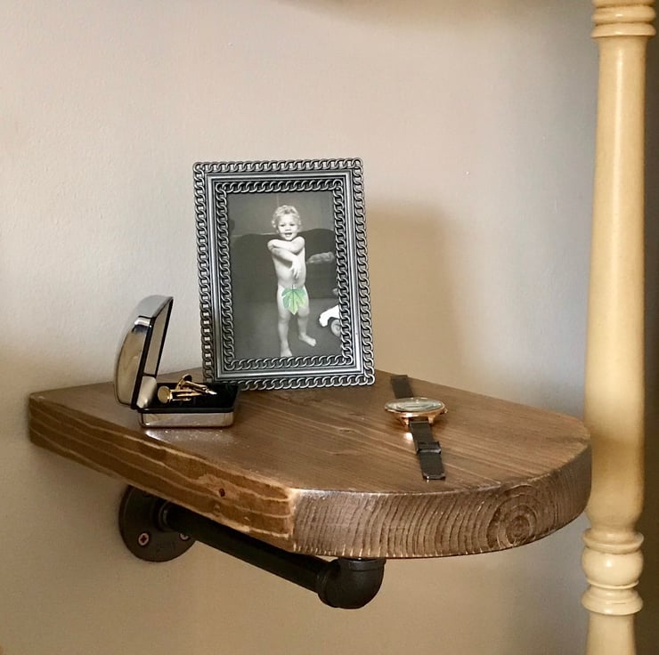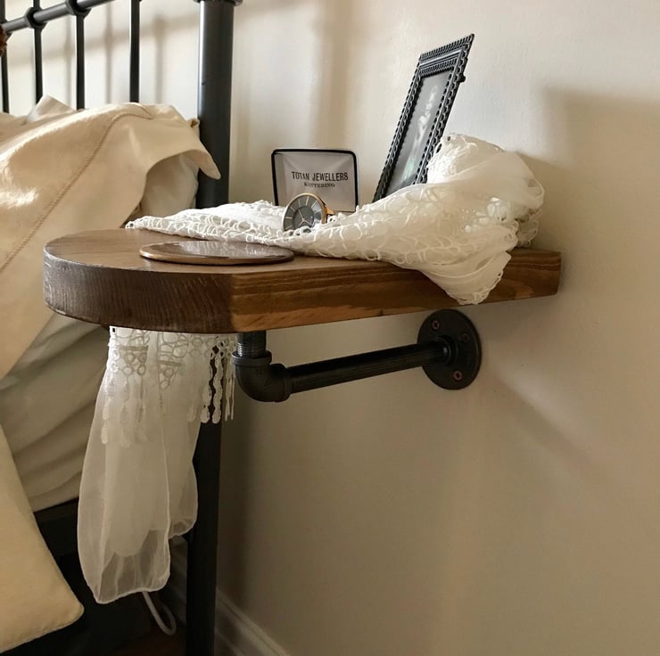 Bedside Table for difficult Spaces, Wall Hung with malleable Iron Pipe Bracket, A sleek yet rustic look, sometimes with scars and dimples but we kinda like that....We can make this in doubles too and we also have these listed in our shop. We can make them really small too if you have an extremely small space.