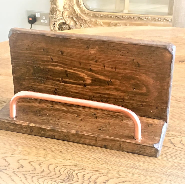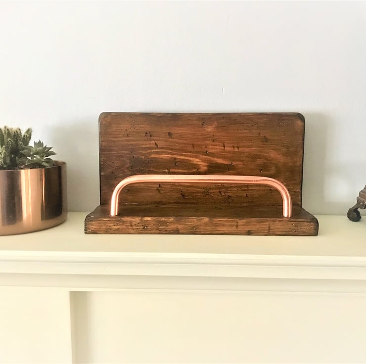 This is a carefully chosen piece of old timber, fashioned into this slick little handy docking deck. Note the Copper Bar is a flattering metal with anti-bacterial properties too. Leave it free standing on a convenient shelf or hang it in a permanent favourite place.