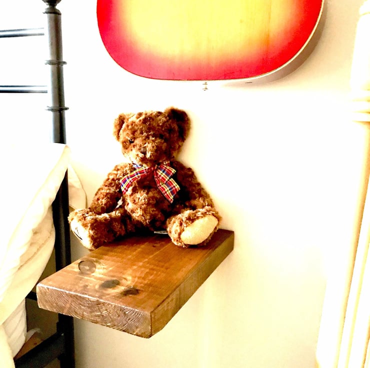 Another of our wall hung shelves, this time a crisp rectangle. Sometimes there's a need for a cleaner line, neat and practical too. Lot's of uses for these, not just bedside. Maybe a smaller book shelf, or ornament dock.