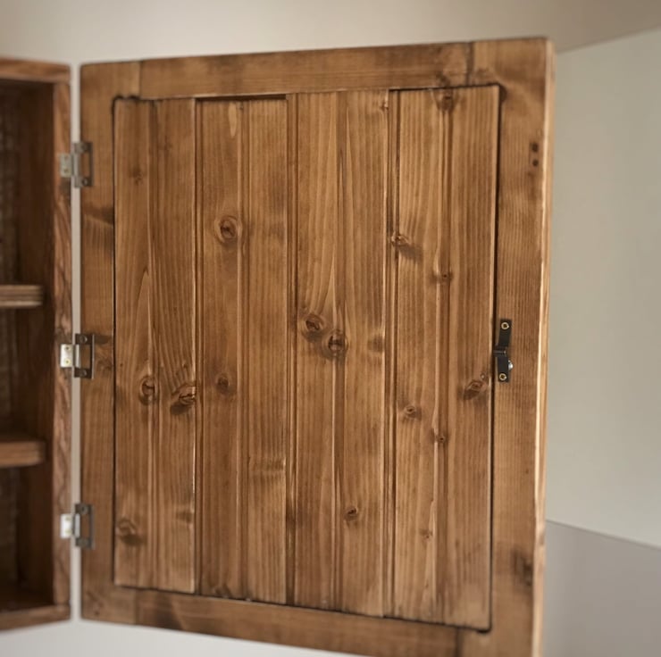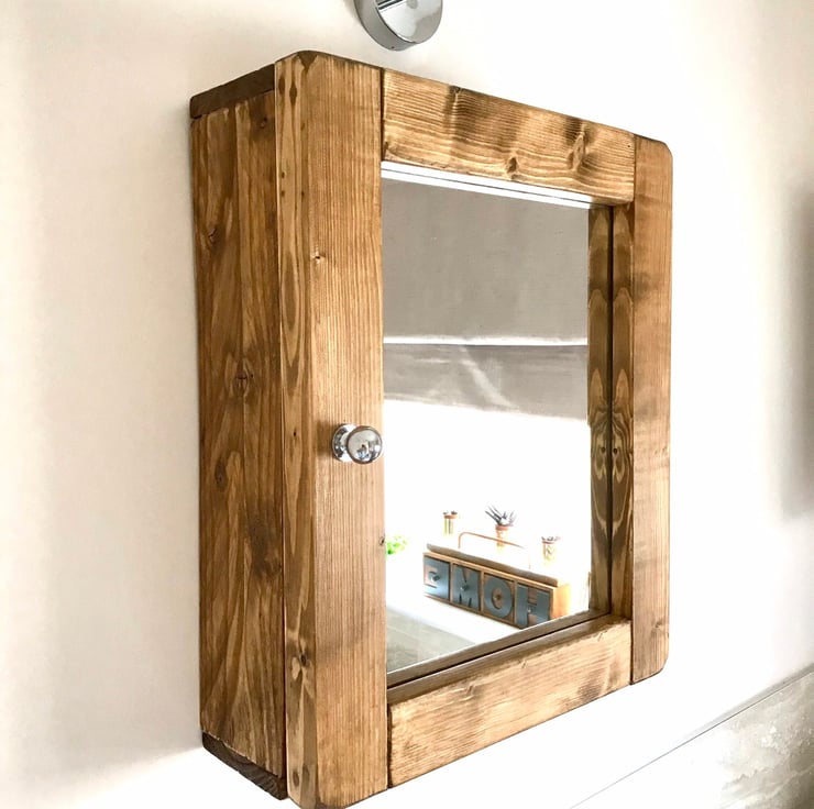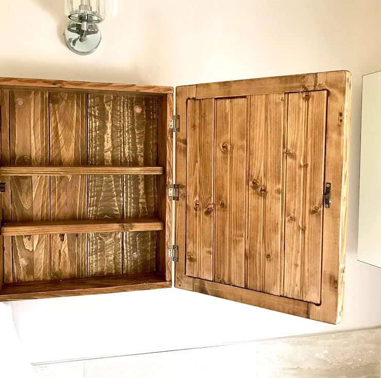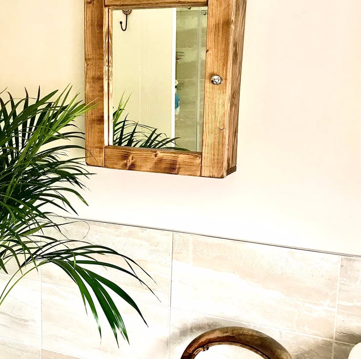 The Norfolk is a Homely Bathroom Glass Mirrored Cabinet, Beautiful Salvaged Timber handmade Cabinet for bathroom or Washroom, Holds a lot. This Interesting piece of cabinet furniture looks amazing in a crisp clean clinical setting or a country cottage look. In fact we have emulated the cottage look. So pleasing. The shelving is all solid timber too. In fact it's solid timber throughout. The grains we select are all individual of course as every tree is different. This is a reversible design so whether you need yours left or right handed, simply turn it the way you need it. This is what makes timber such a designer piece in itself. The mirrored door is backed with timber, sealed up well. The door is finished with an antique bronze knob (not as in pictured here). Steel hinges.