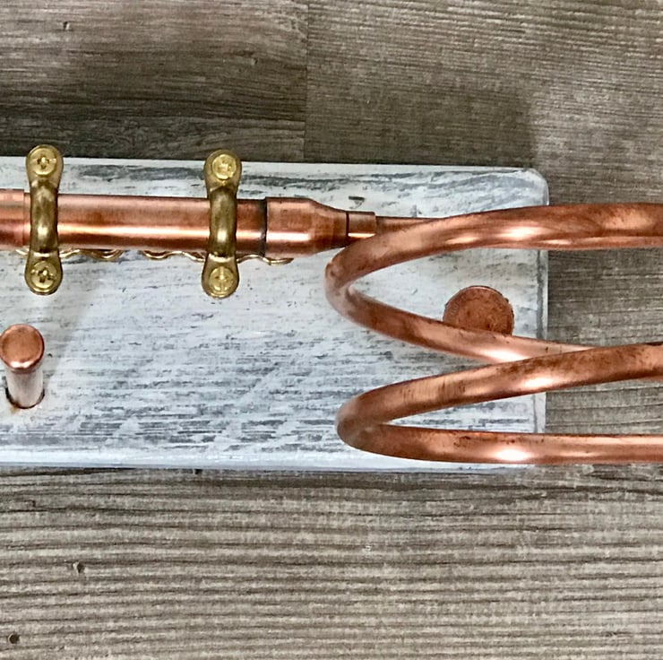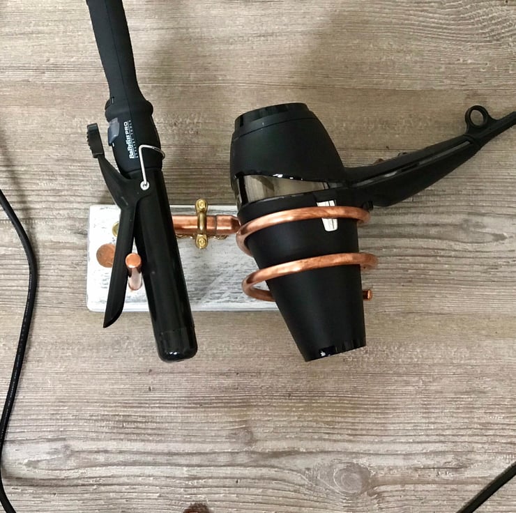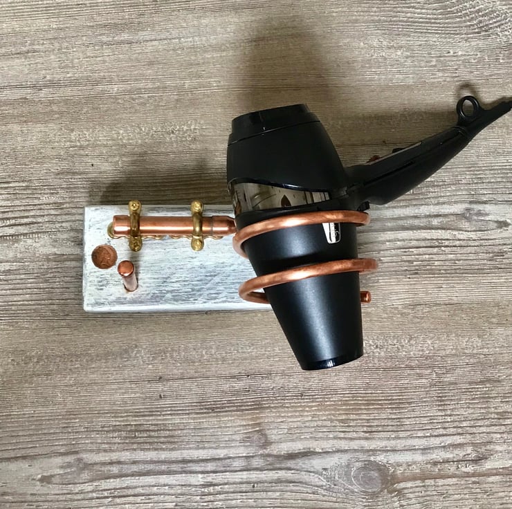 Hairdryer and Salon Hair Tool-kit holder. Reclaimed Timber, Copper and Brass fittings mounted onto this to cleverly hold all the important things you need to groom your hair.