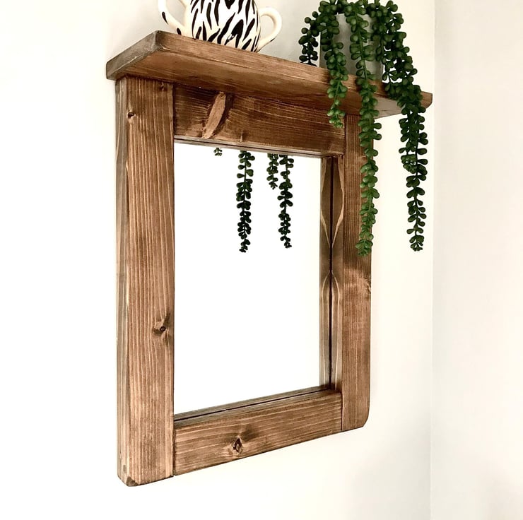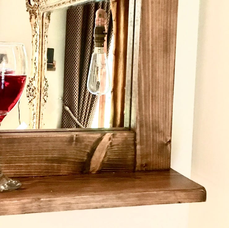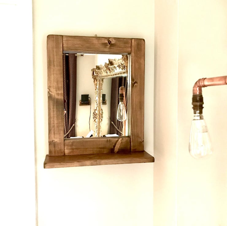 A beautiful handmade mirror using quality old timber. These mirror are reversible giving you the option for either a top shelf or bottom depending how you want to arrange your effects. We can stain these lighter or mid oak or maybe a rich Jacobean colour. We can achieve a colour to suit your preference. Please measure your space and check against the sizes of our mirror to avoid expensive returns.