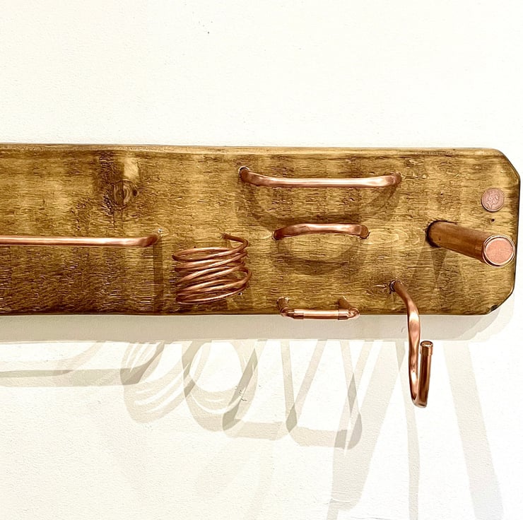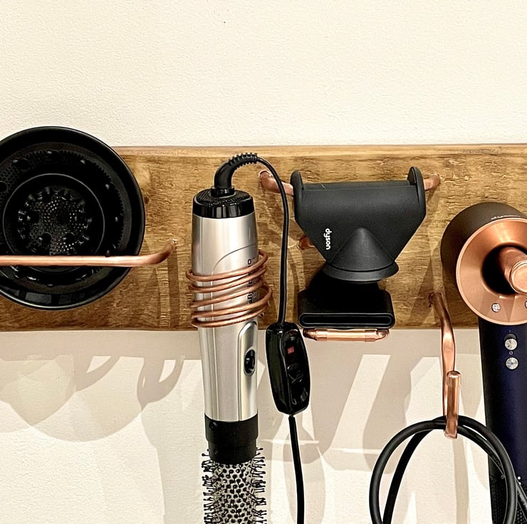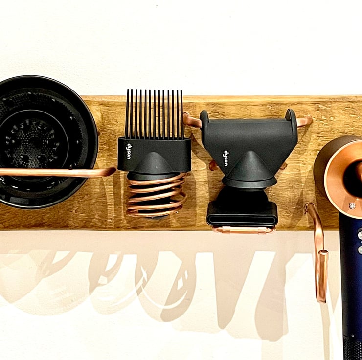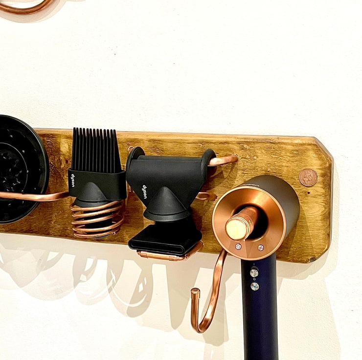 Note the beautiful copper parts that are designed to hold each piece perfectly being a mix of hooks spirals and rings etc. The Dyson Hairdryer is a superb design and should be treated with love and care. So we have ensured in this design that the beautiful copper peg is not only lovely to look at but beautifully practical too. All thats needed is a swift quick movement to slip it onto this attractive and sturdy holder. We can tweak this to suit your personal requirements. You may want a smaller design to hold just a couple of Dyson tools maybe.