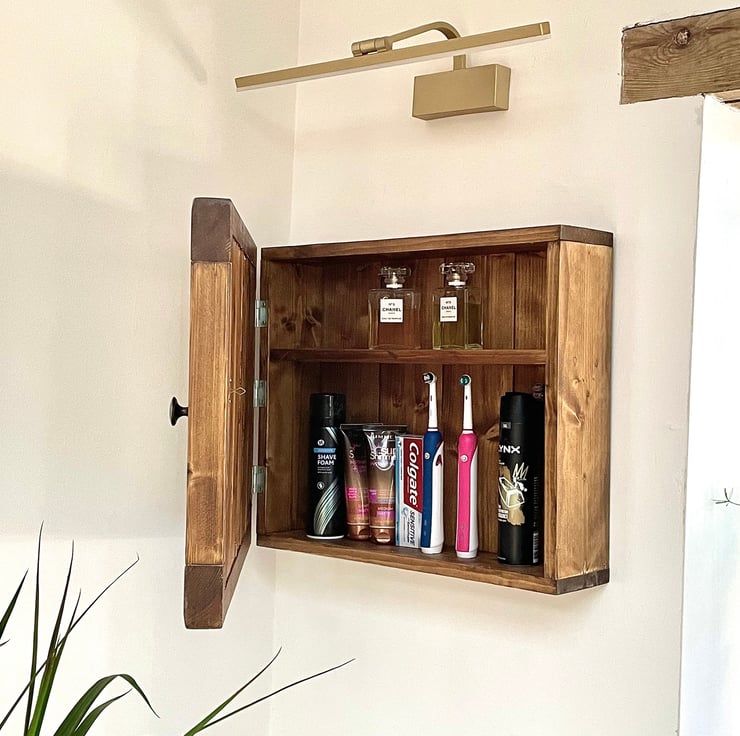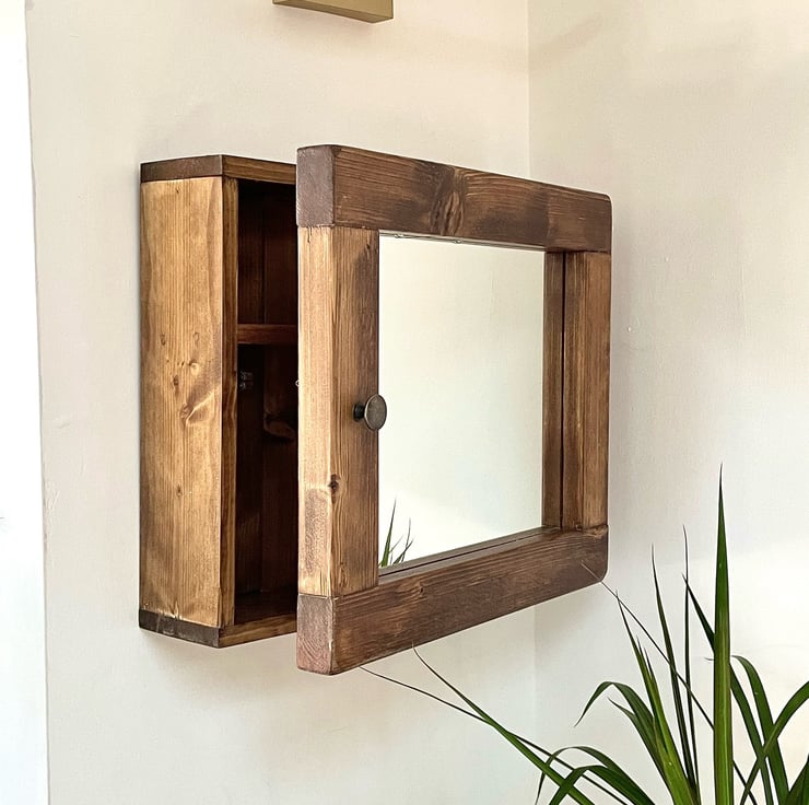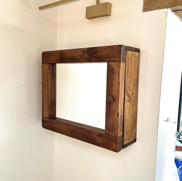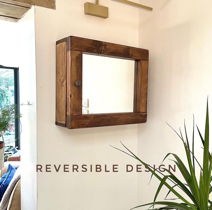 The Chester is a Fabulously Shaped, Bathroom Glass Mirrored Cabinet, Quality Rustic Salvaged Timber handmade Cabinet for bathroom or Washroom, Holds a lot. This Interesting piece of cabinet furniture looks amazing in a crisp clean clinical setting or a country cottage look. So pleasing. This design is landscape in proportions. The shelving is all solid timber too. In fact it's solid timber throughout. The grains we select are all individual of course as every tree is different. This is a reversible design so whether you need yours left or right handed, simply turn it the way you need it. This is what makes timber such a designer piece in itself. The mirrored door is backed with timber, sealed up well. The door is finished with an antique bronze knob (as in pictured here).