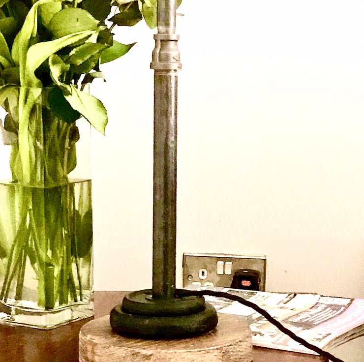 Table Lamp, Iron Pipe amounted onto Attractive weighted Salvaged Timber Base. Malleable Iron takes on the look of a Pewter Finish. Retro Braided Cable with inline switch set in for ease of use. Fitted with black 3 pin plug. Antique BC lamp fitting.