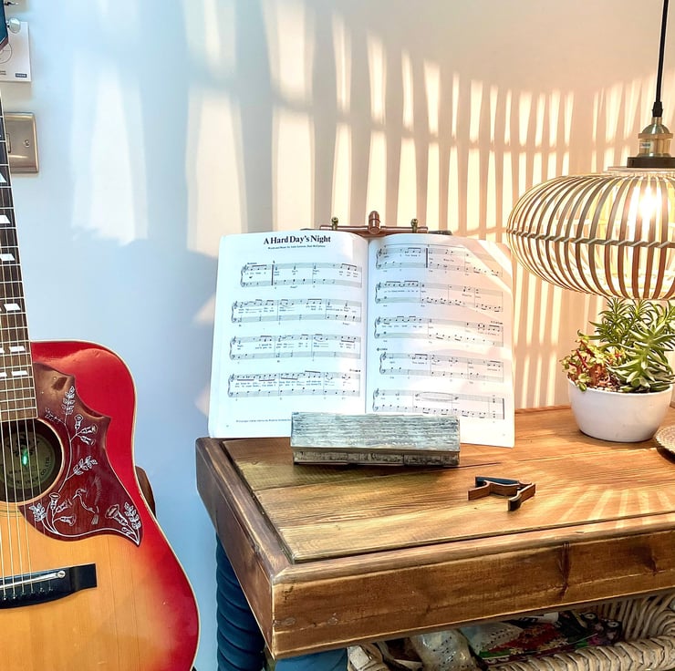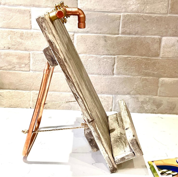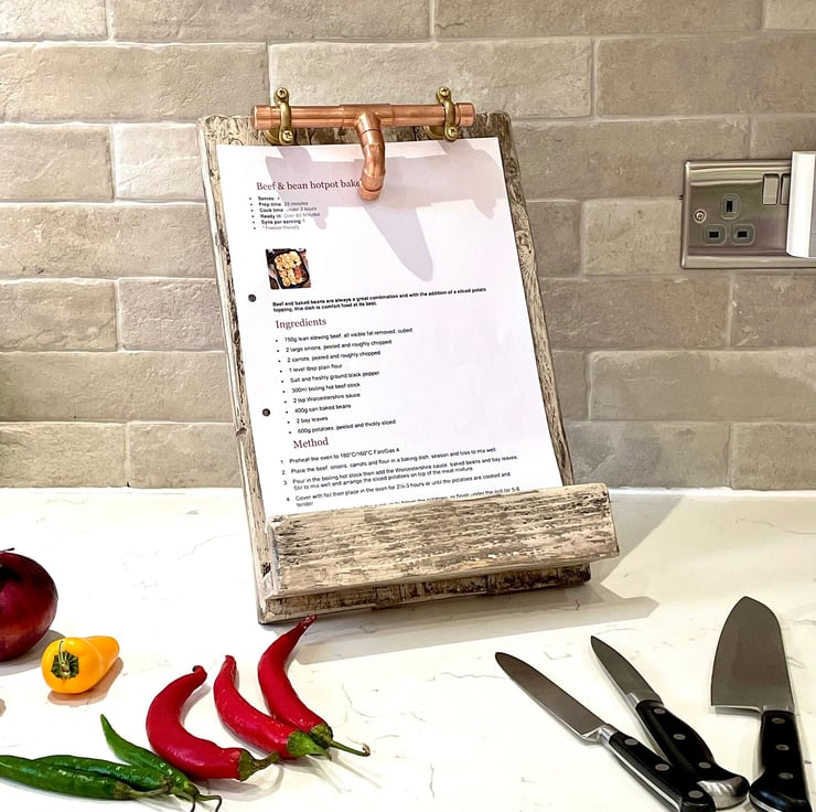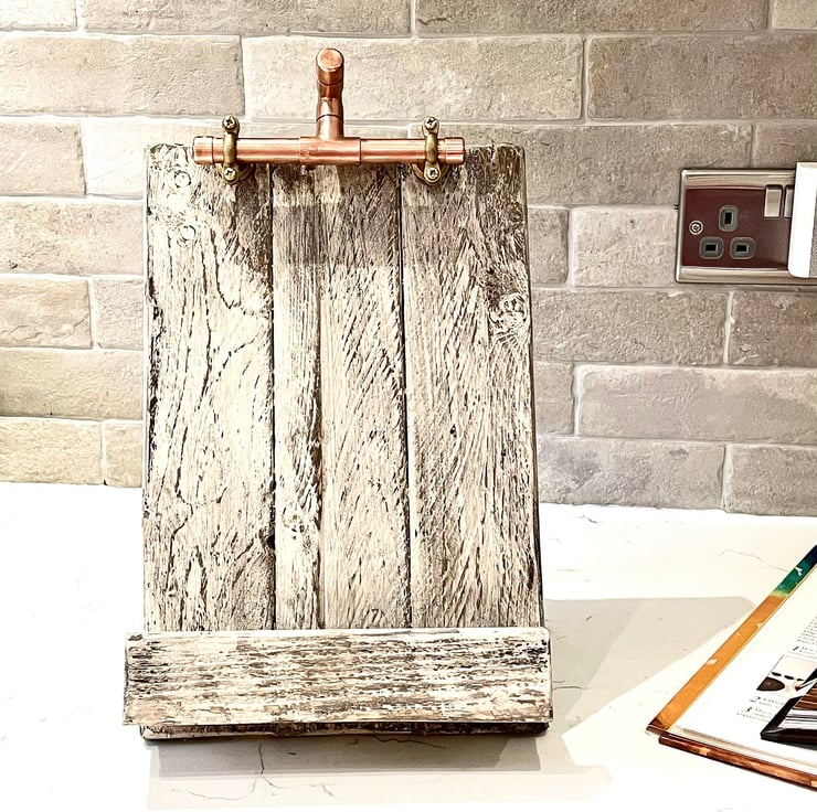 We designed this with great care and attention as were brilliant at cooking here! Old Timber with its grain enhanced by us using an ivory chic paint that we mix and create ourselves. Sealed with a tough finish to make it easy to wipe clean. Zoom right in and Take a closer look at the photos in our listing here and see the copper details as well as the clever practical way it functions. This is such a fabulous gift too for that keen cook and cake maker. Then when cookings done, get the sheet music out and strum a few chords. The natty little flip up & down copper stay will hold a piece of paper tight too when you want that A4 recipe to refer to as well as the hand written ones.