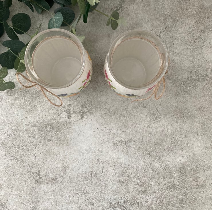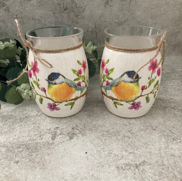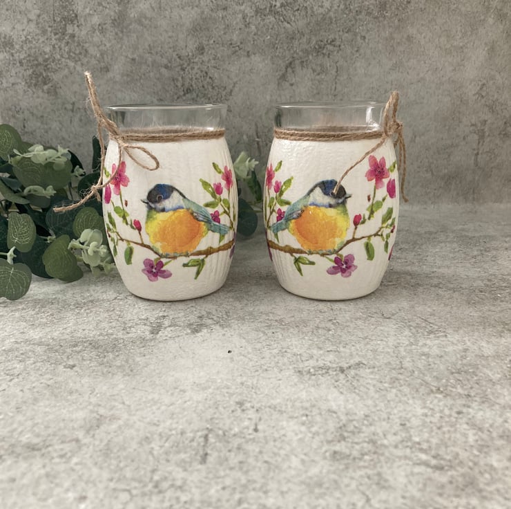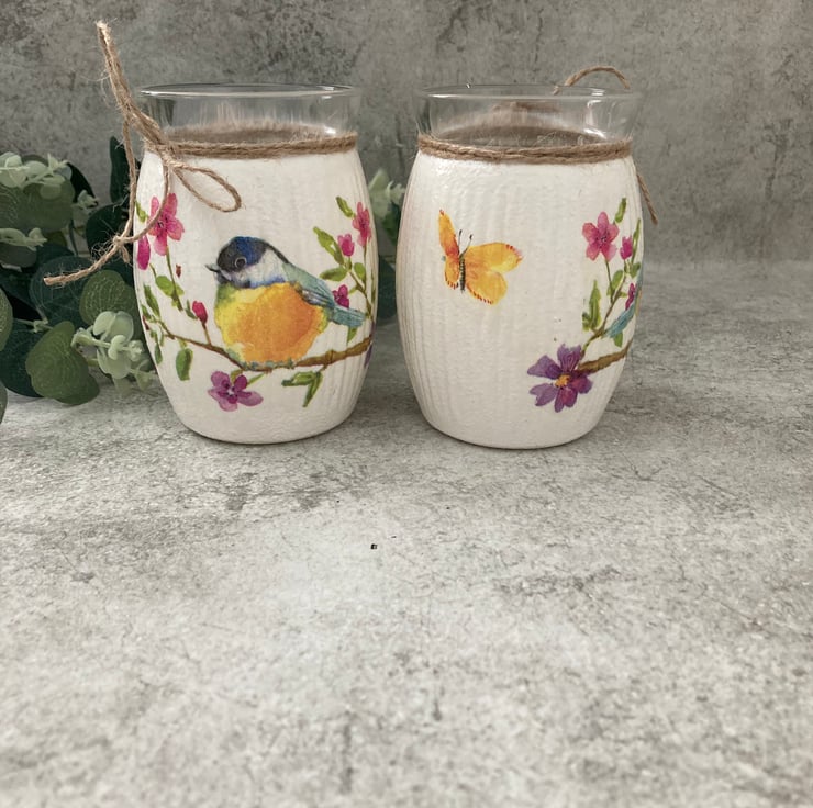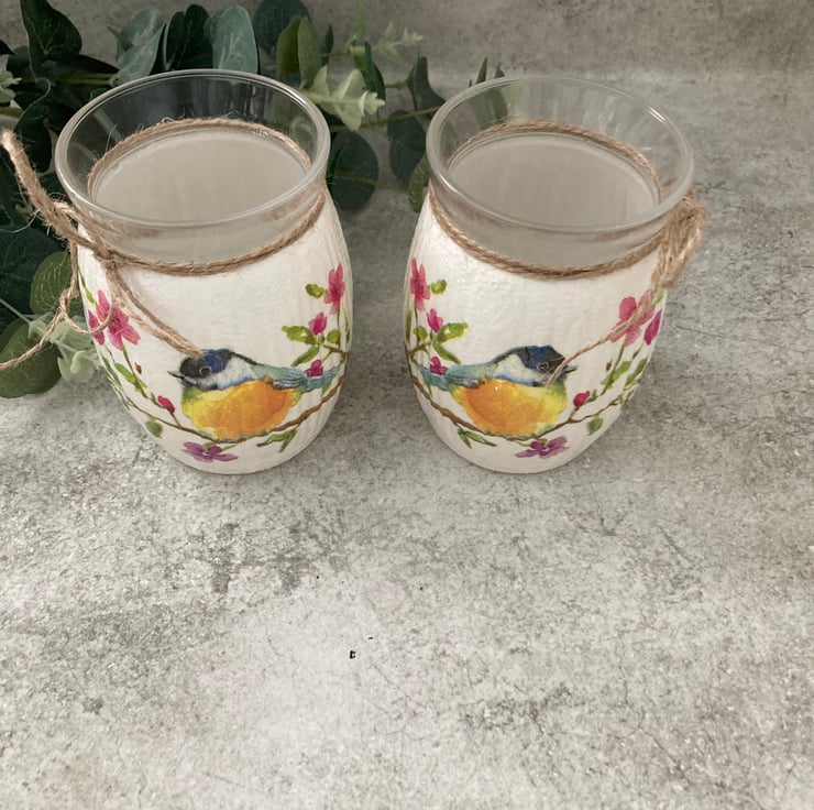 The vases have been part painted using a chalk paint and decoupaged with a lovely blue tit and Spring floral design and finished with natural jute twine tied in a bow around the rim. The French vases have a ribbed design and have been finished with several coats of heat and water resistant satin varnish for protection.