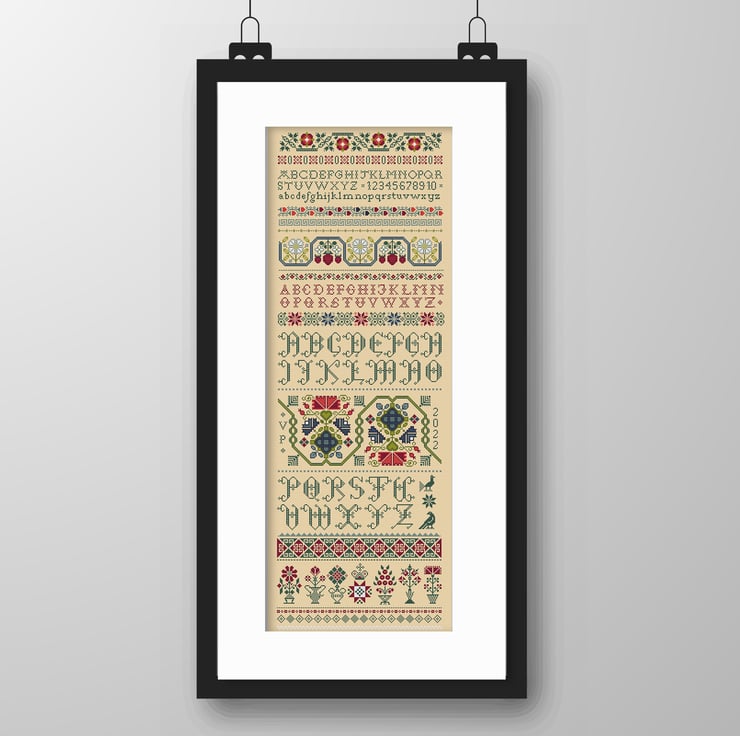 Fancy a challenge! By customer request please see cross stitch Quaker SUPER LONG band sampler with full alphabets, flowers, vases, borders, Ackworth style vintage folk art PDF counted chart 107C