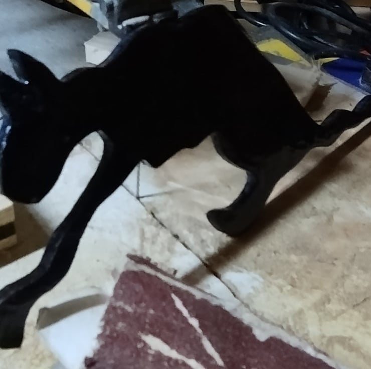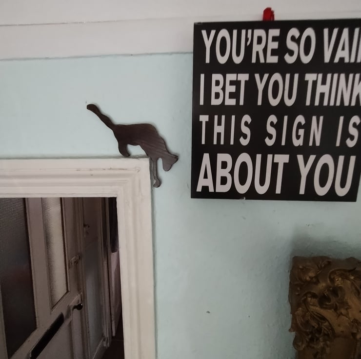 we love our cats.....I have seen a few of these "door toppers" on line and fancied a go, so I sketched a few ideas and cut one out..... quite surprised when my family liked it.... so I cut out a few more to offer for somebody else to love..... ( we used a little piece of blue tack to hold ours in place...so suggest you consider the same.... I won't send any blue tack, just the ply wood, which has been cut out, sanded and stained with black spirit stain, then finished with "chestnut acrylic sanding sealer"...which is safe for toys... it's nice as you can see the wood grain, the black stain has not completely obscured the texture of the wood.
